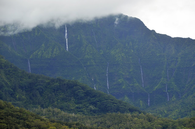 Zooming in further, you can see at least half a dozen ridiculously tall waterfalls. Nāmolokama Mountain is 4400 feet tall and has dozens of waterfalls, some of which seem to come right off the top of the mountain, which doesn't seem like it should be possible. Apparently it has a long, gently-sloping plateau at the top that feeds these falls. This, combined with the fact that the top is the "rainiest point on earth" keeps these huge waterfalls flowing continuously.