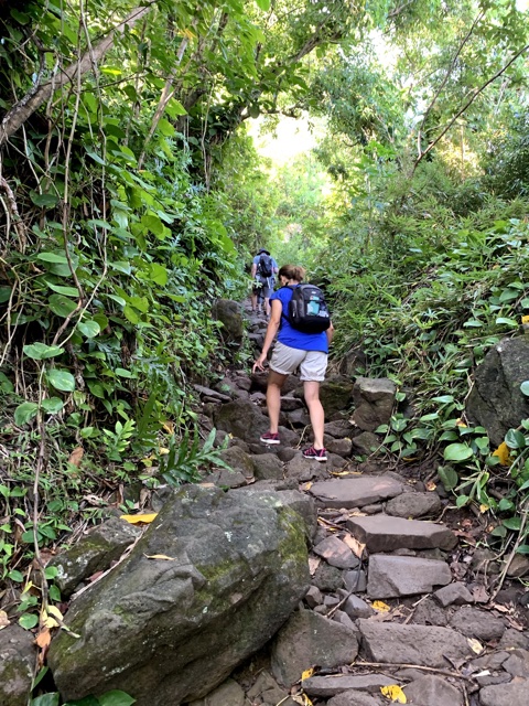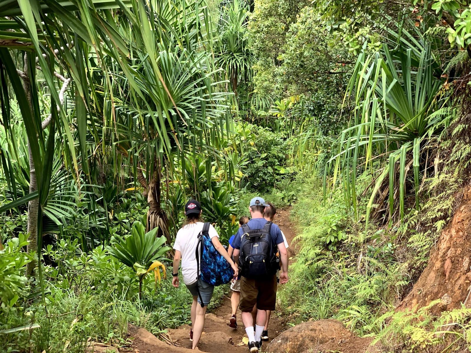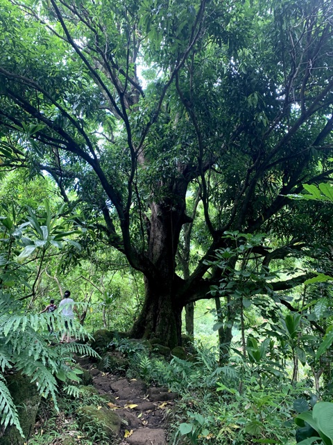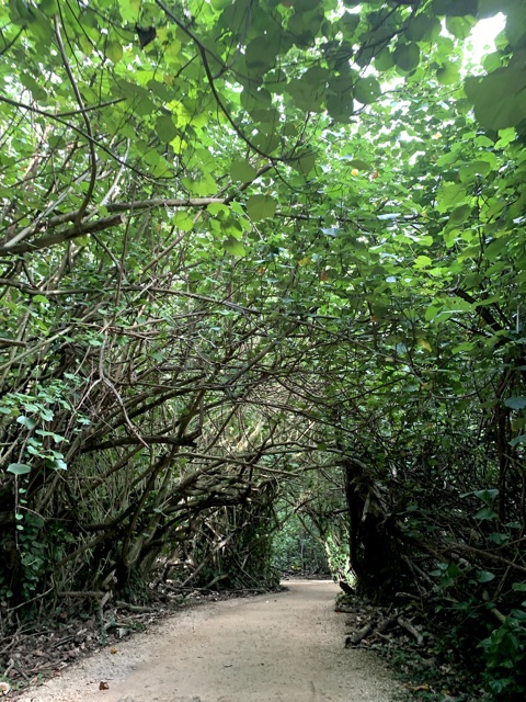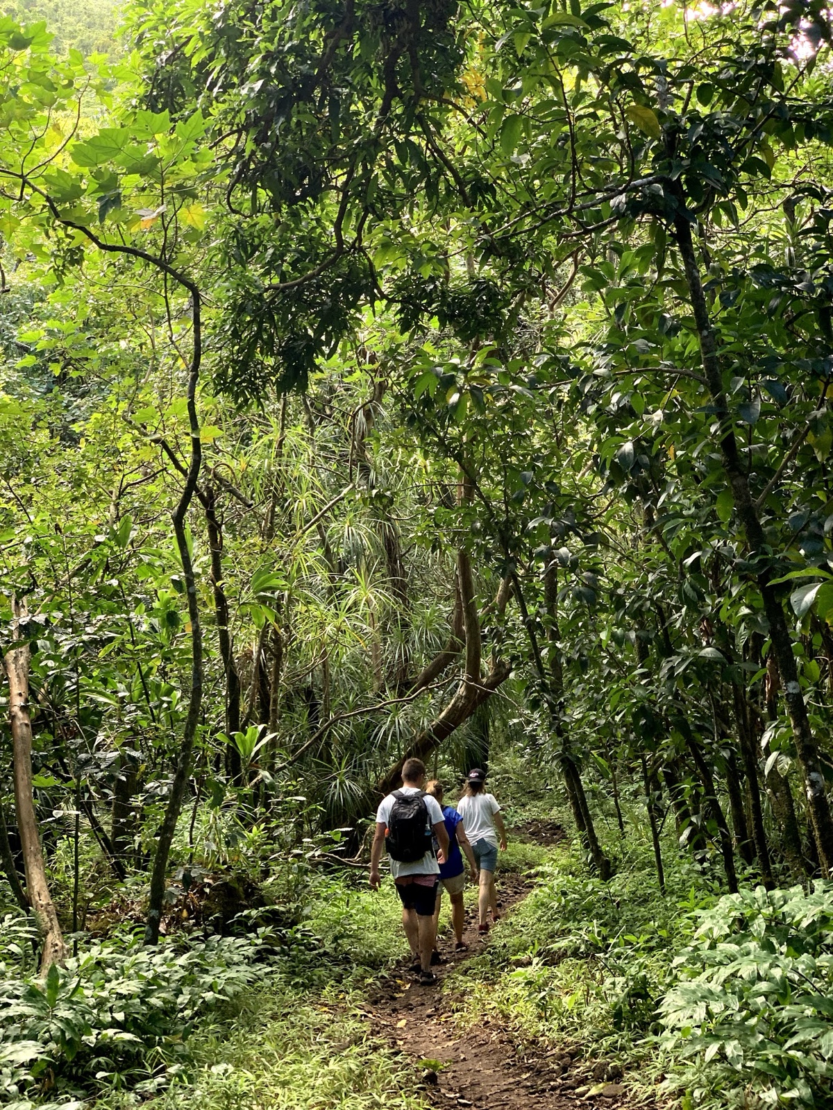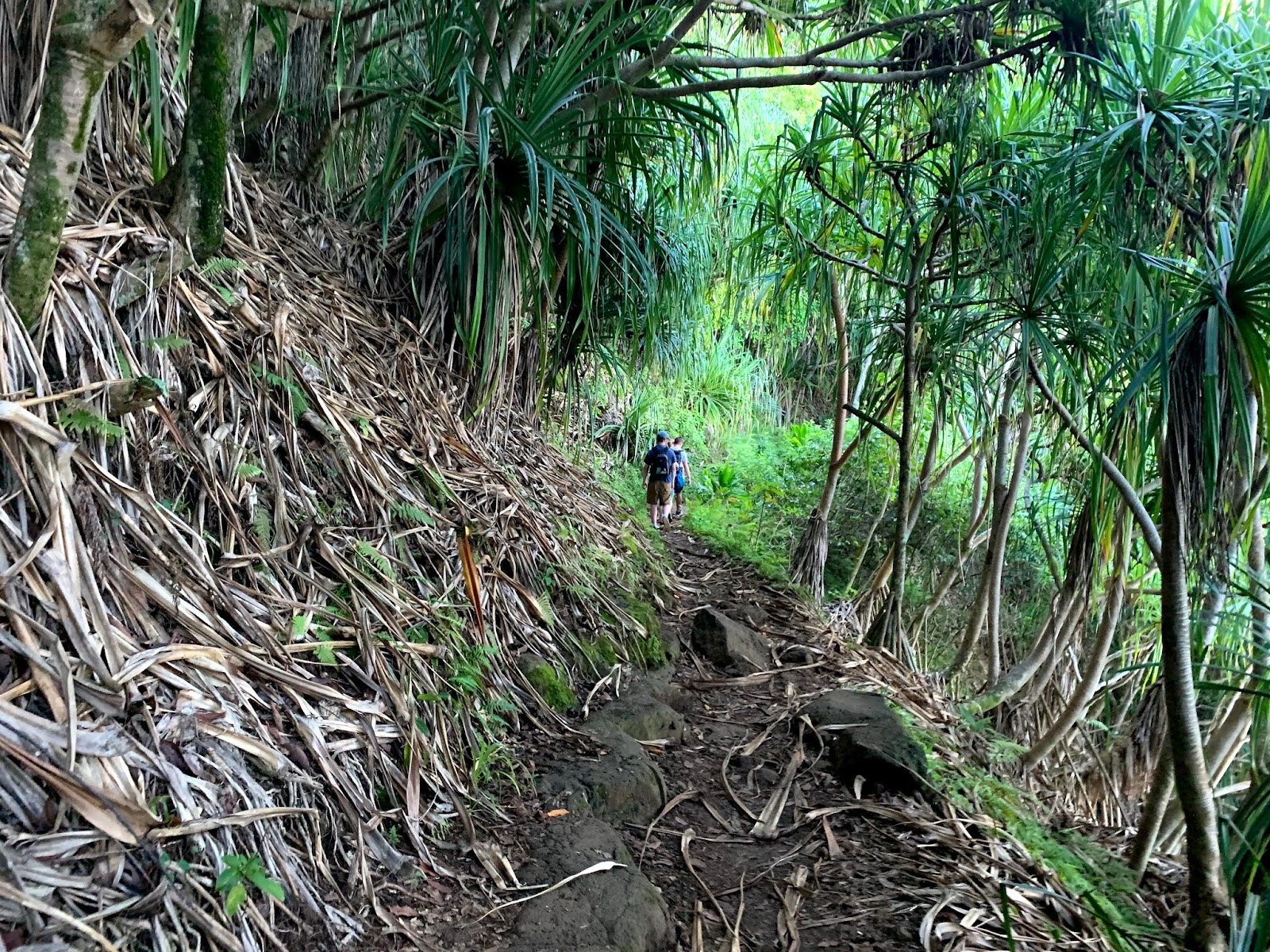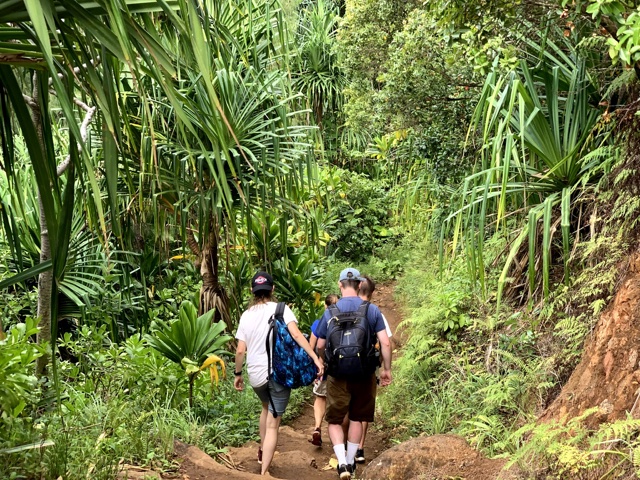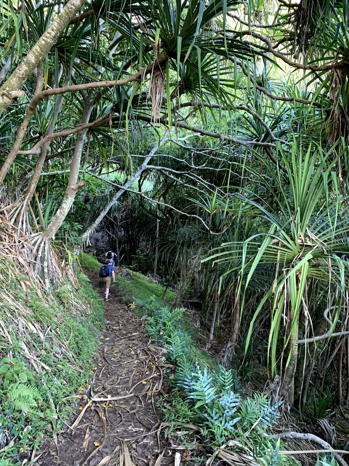 We had to buy morning, mid-day and afternoon passes in order to have time for our long, steep hike, which started at Hā’ena State Park, where we walked through this tunnel of trees.