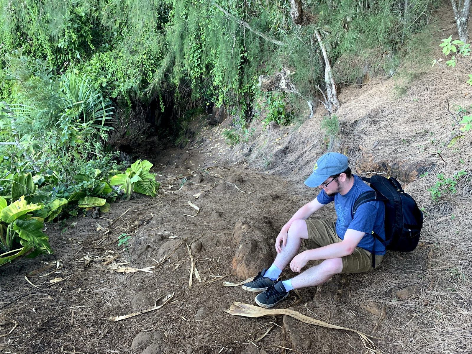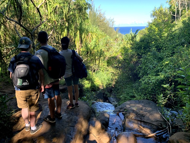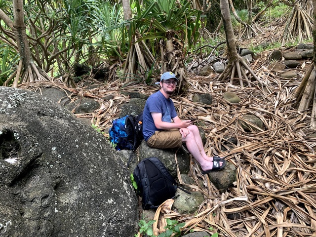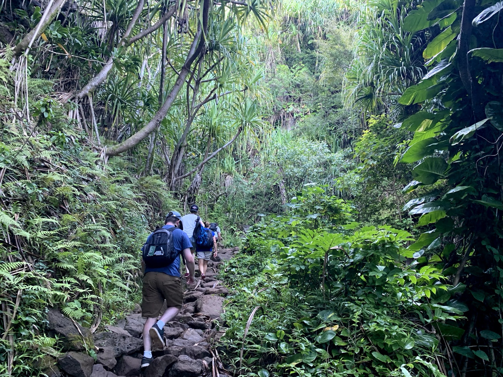 Our plan was to hike two miles to Hanakāpī‘ai Beach, then another couple miles up to Hanakāpī‘ai Falls and back, with a picnic lunch somewhere along the way. The total hike would be 9.1 miles with 2,600 feet of elevation gain (and loss) along the way.