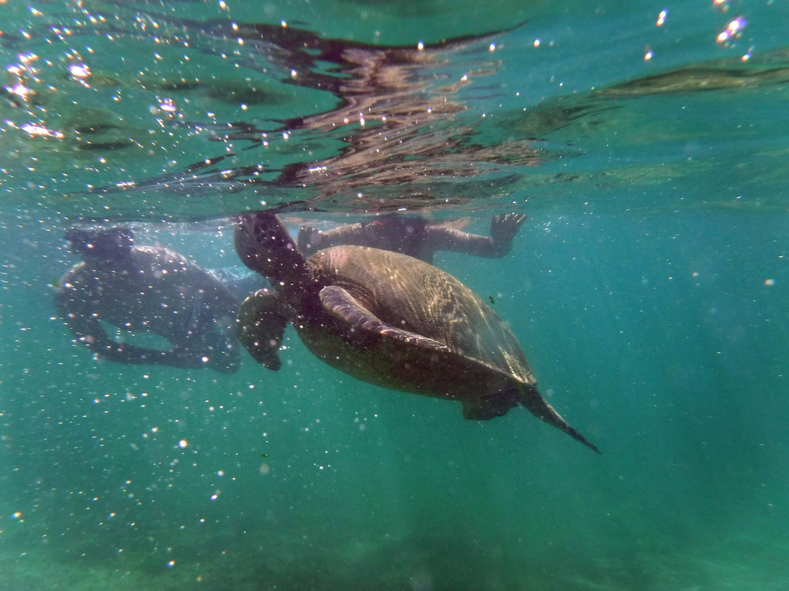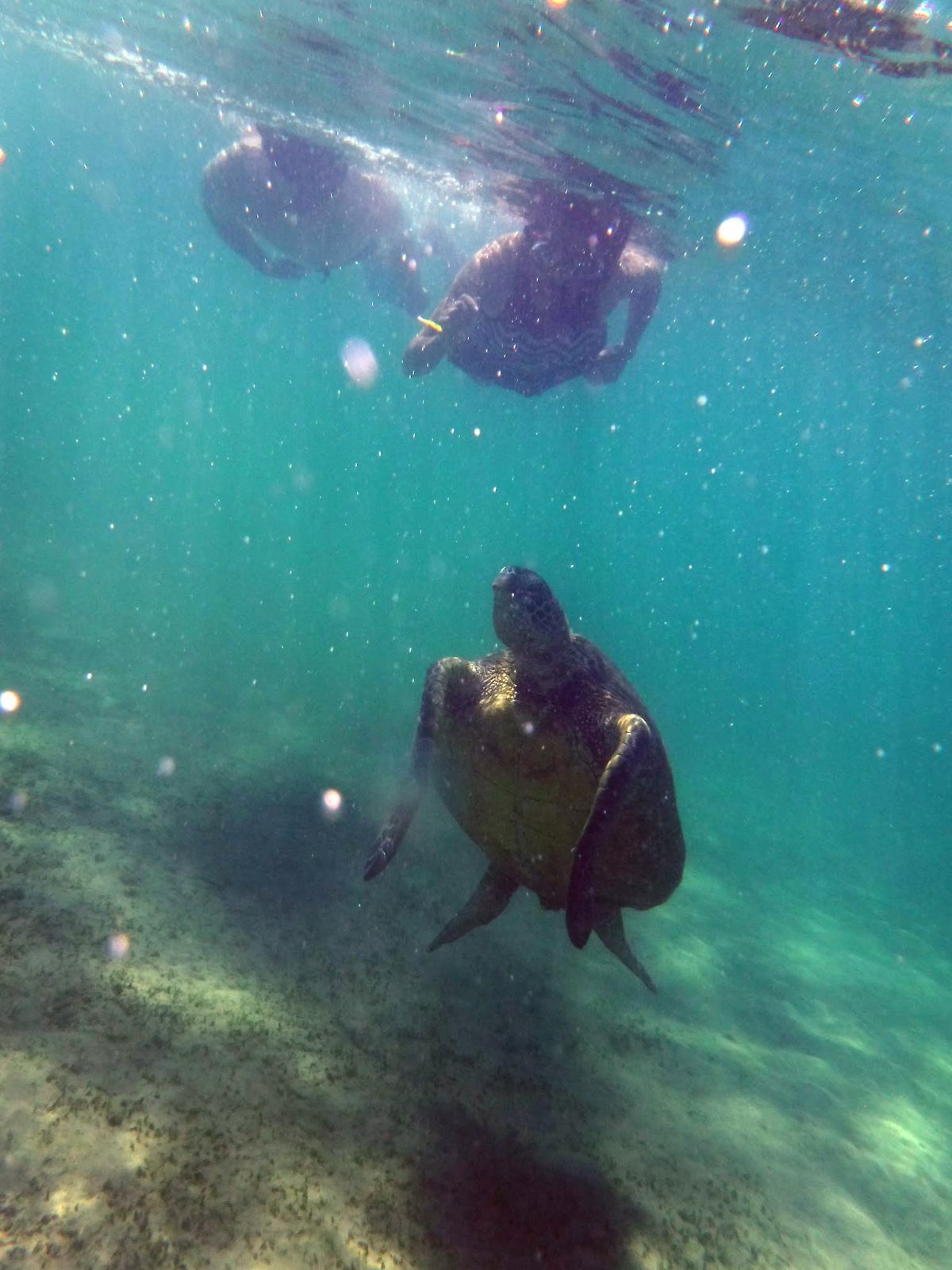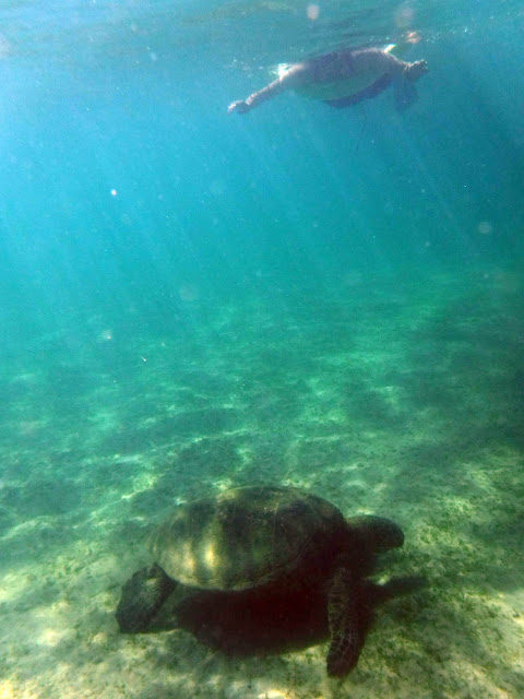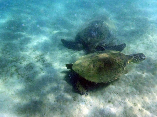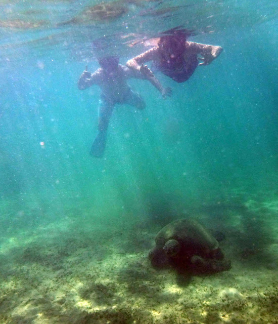 Here's a 1-minute video showing Jared and Linette swimming near the turtle as it comes up for air and goes back to keep eating. We made sure we didn't touch them (which is against federal law). They appeared to keep on eating, so it didn't seem like we were disturbing them much.