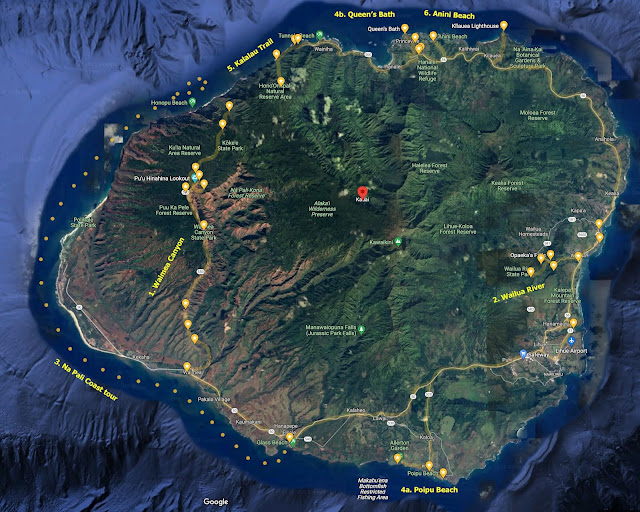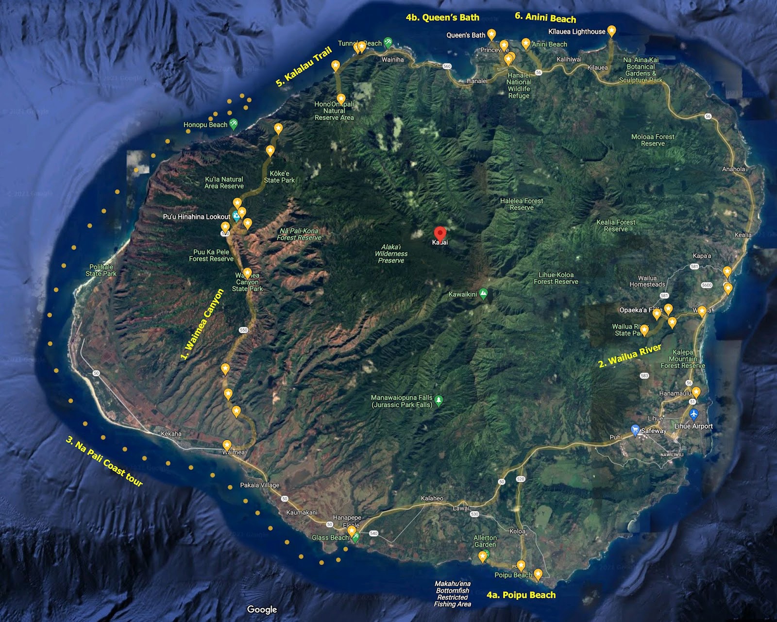 This map of Kauai shows yellow flags where we did stuff, yellow dots where our boat tour went around the island, and yellow lines showing where we drove or hiked. It seemed like we did everything except the middle!