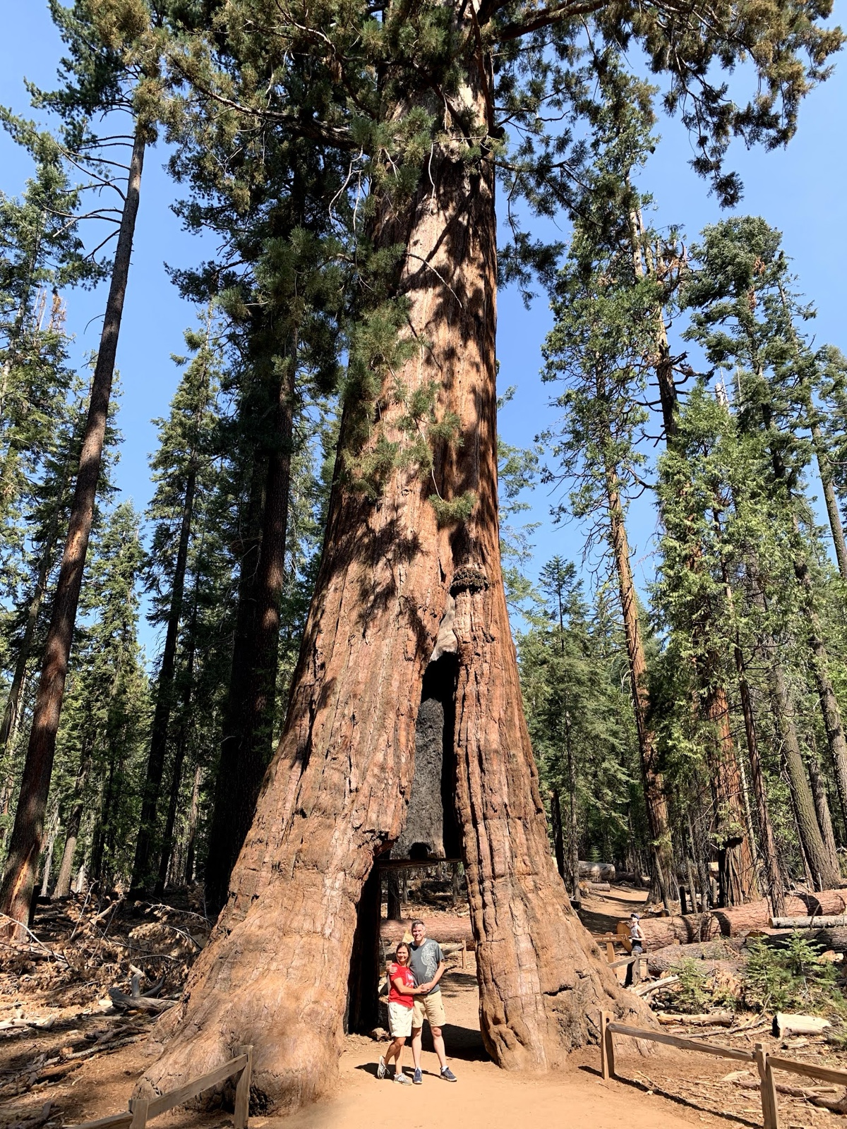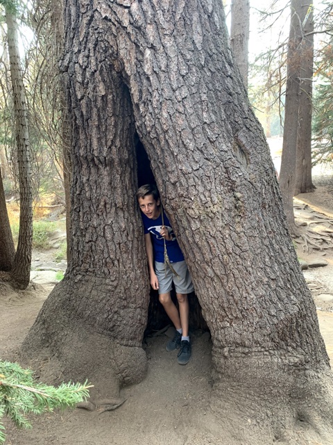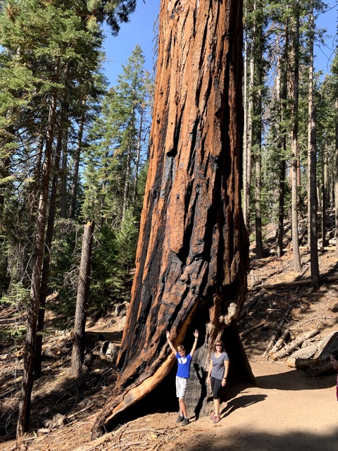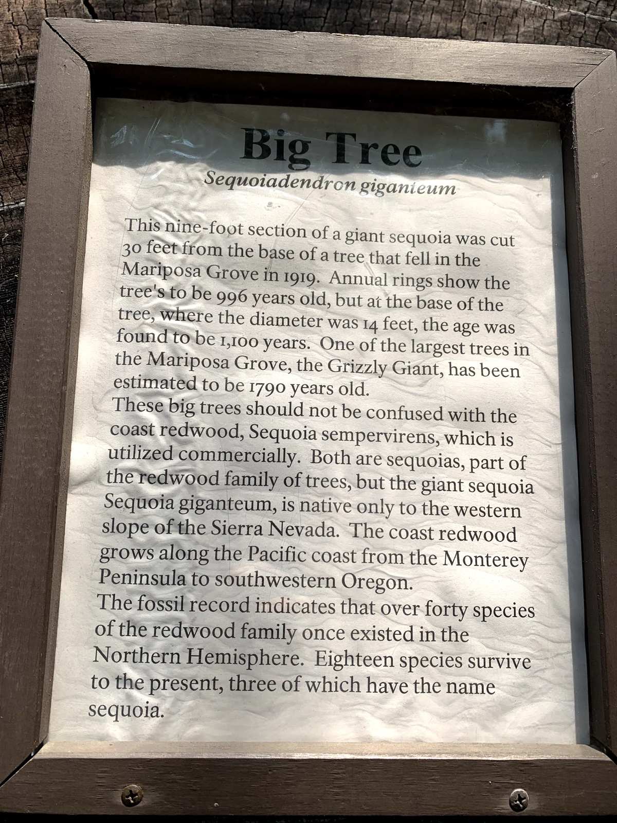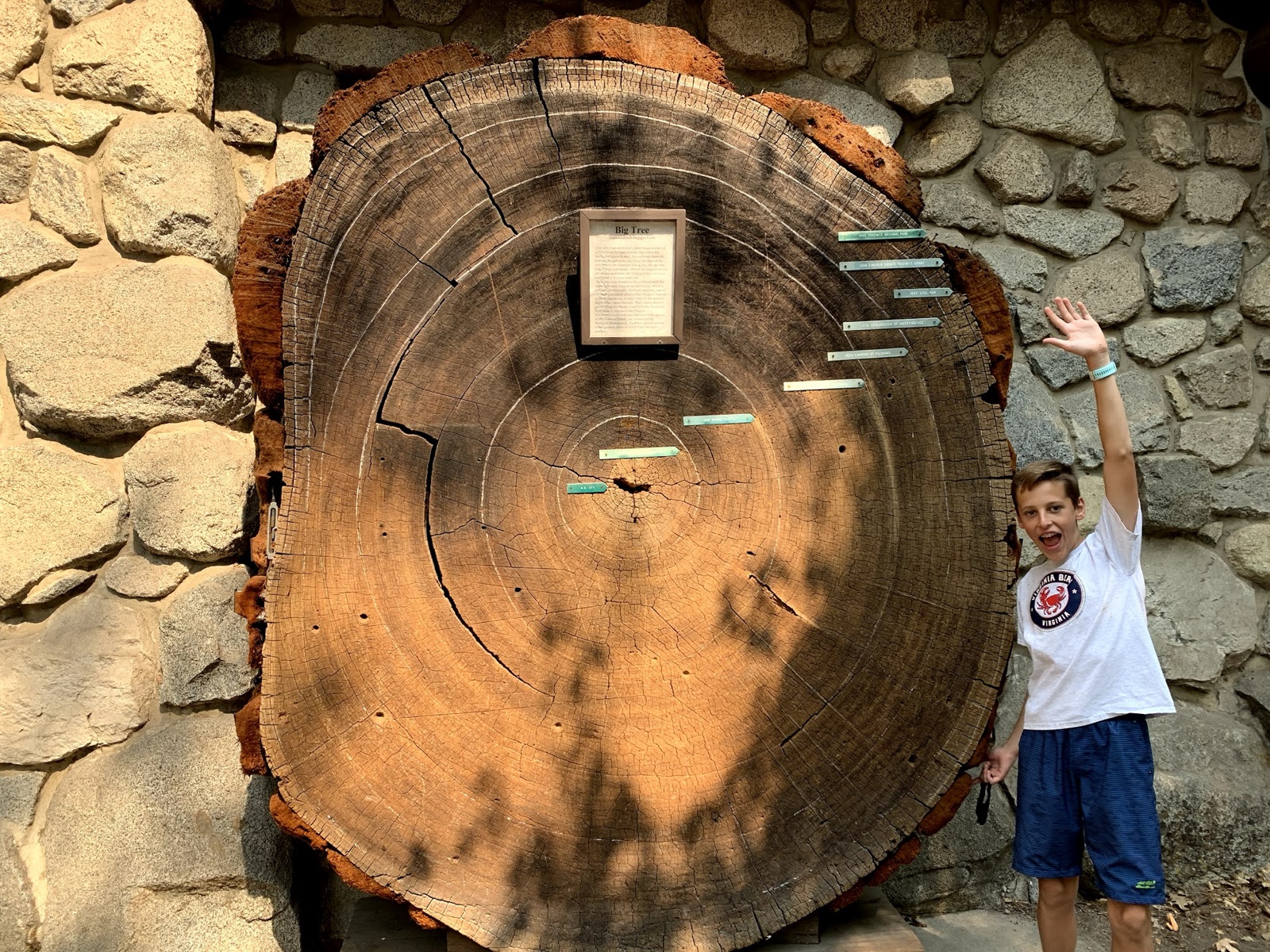 We stopped at the Yosemite museum, but it was closed (perhaps because of COVID and/or the season). But they had a section of a redwood out front that Grant stood by to show how big it was. Little markers showed what date things happened, including (from inner to outer):