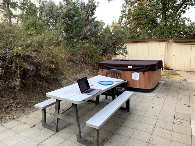 It had a hot tub we used the first night, and had an outdoor place to eat (or catch up on e-mails) in the mornings.