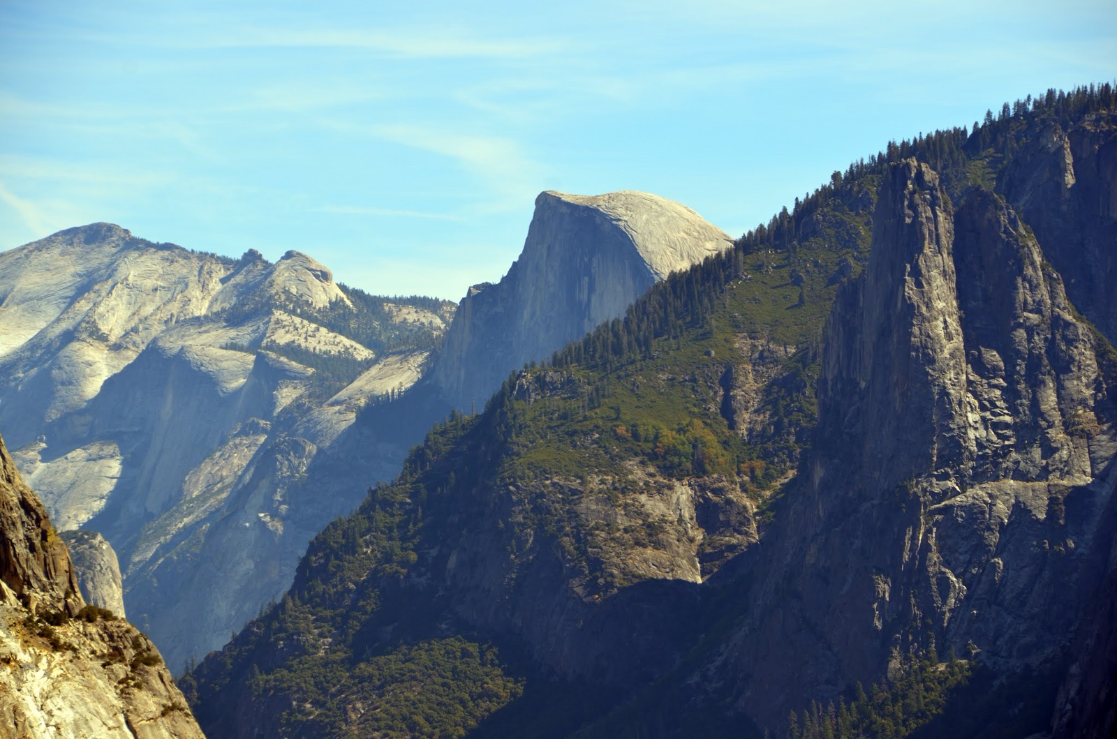 The guide told about how Yosemite used to be under the ocean; was pushed up by tectonic plates colliding together; was shaped further by glaciers grinding through the valleys; and how erosion exposed the bald rock surfaces at the top, but dirt accumulated elsewhere to support trees and other plants. Or something like that.