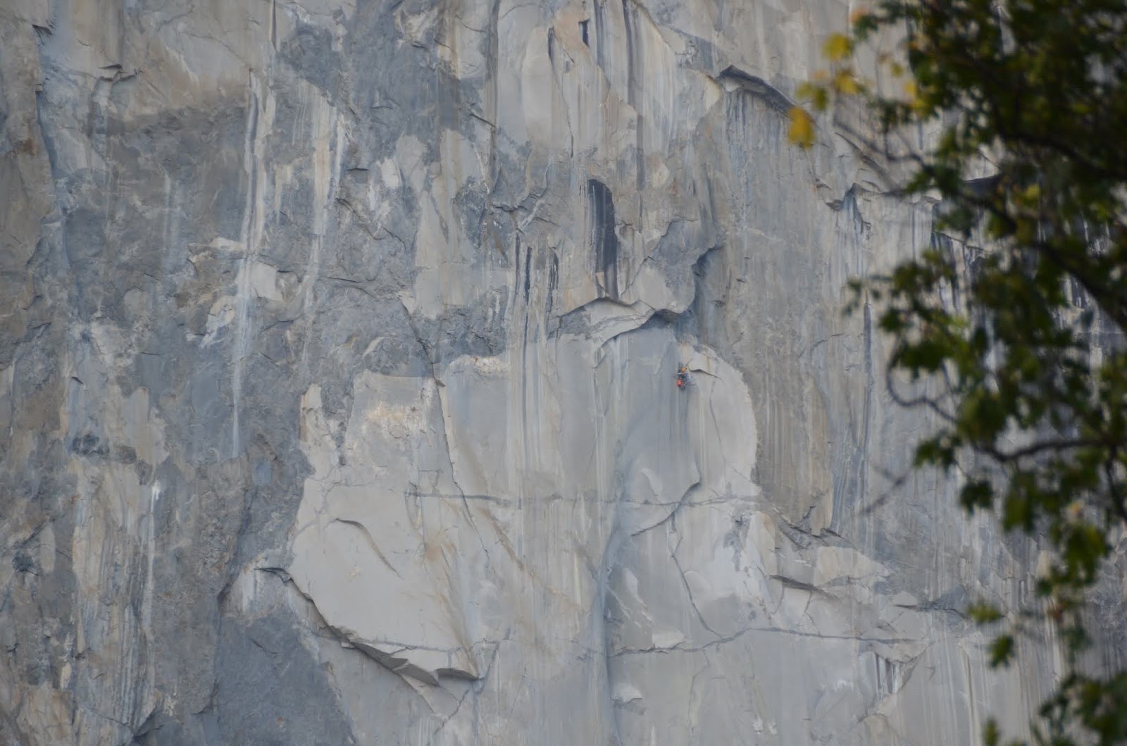 When I zoomed way in with my 200mm telephoto lens (11x zoom), I could just see some rock climbers. In this picture, there's a green speck in the middle.
