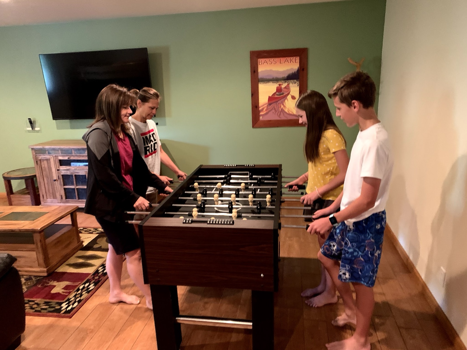 The foosball tournament that night was between the moms vs. the kids. (Kids won).