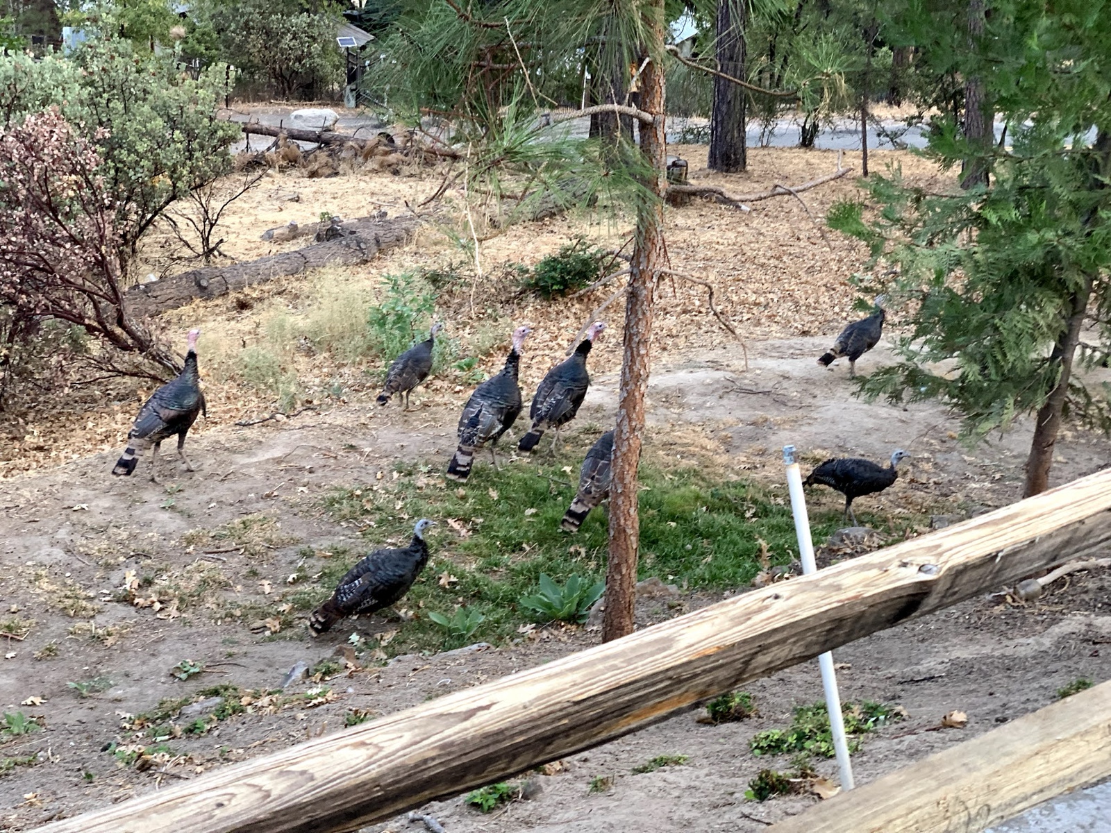 Friday morning, September 24, 2021, one of the kids thought there were vultures outside (because of the red heads). I went to look and found that it was a flock of wild turkeys.