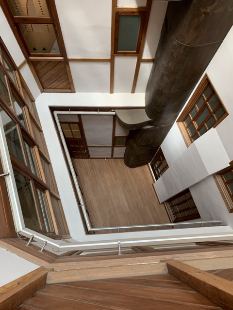 The building was used for a few different things (warehouse and residences; then as bank offices), and is now a museum to Spanish art as well as to the building itself. It had some innovative designs, like the use of iron pillars to create an open floor plan, instead of the typical thick load bearing walls; the use of many windows to provide ventilation and natural light; and this internal courtyard with skylights to provide ventilation and natural light in the center of the building. (And many more that I don't recall).