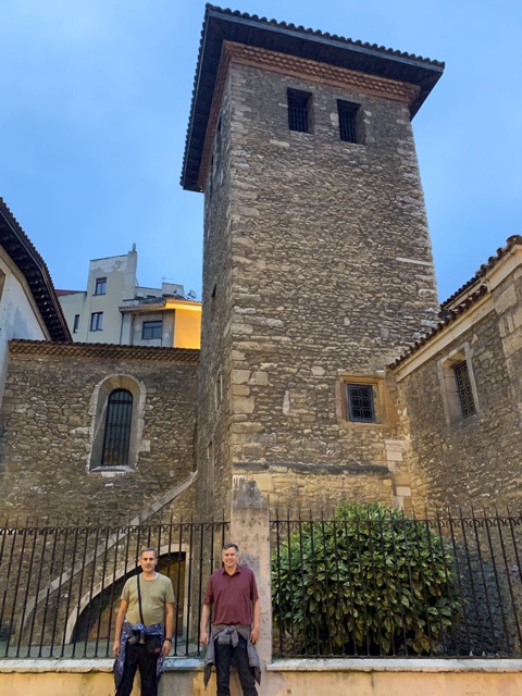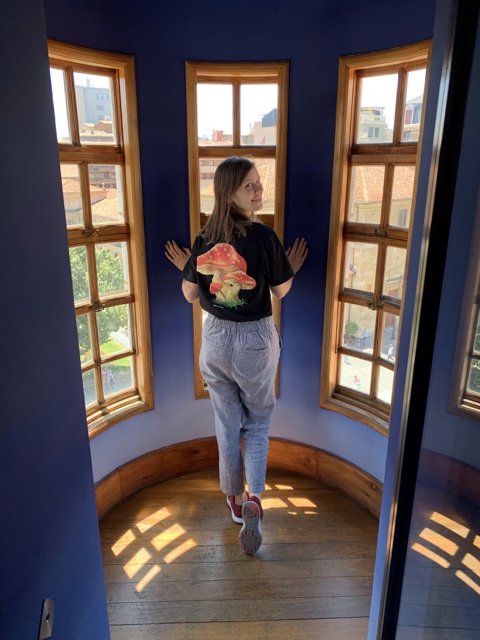 Gaudí designed some pretty funky buildings, but this one was built to look more like the other buildings in town, such as the palace next door. He included towers on the corners, both to provide the look he was aiming for, and also to provide more windows so that there would be more light in the corners of the rooms.