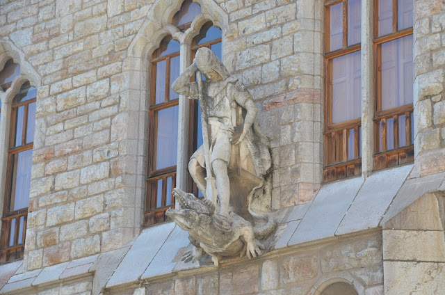 At the front of the building is a sculpture of St. George slaying the dragon, since St. George is the patron saint of Catalonia, where Gaudí was from. One interesting thing was that while the stone used for the building was strong, the stone used for the sculpture was not, so it started to deteriorate in the weather. In 1959 it was decided that it would be replaced with a replica. When they went to remove the sculpture, they were surprised to find a lead pipe embedded inside that had the plans of the building (signed by Gaudí) and some other papers. So the replica has that and another time capsule, just for fun.