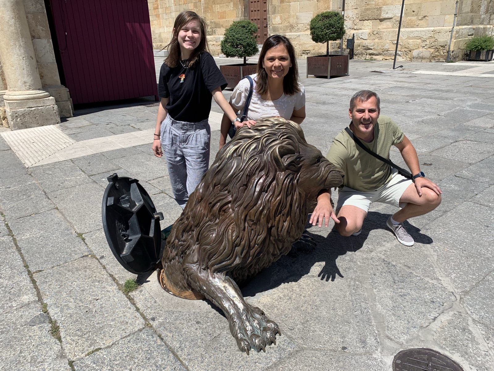 "León" means "lion, and wouldn't you know it, as soon as we walked into town, a bronze lion jumped out of a manhole and bit Nico's arm!! :O
