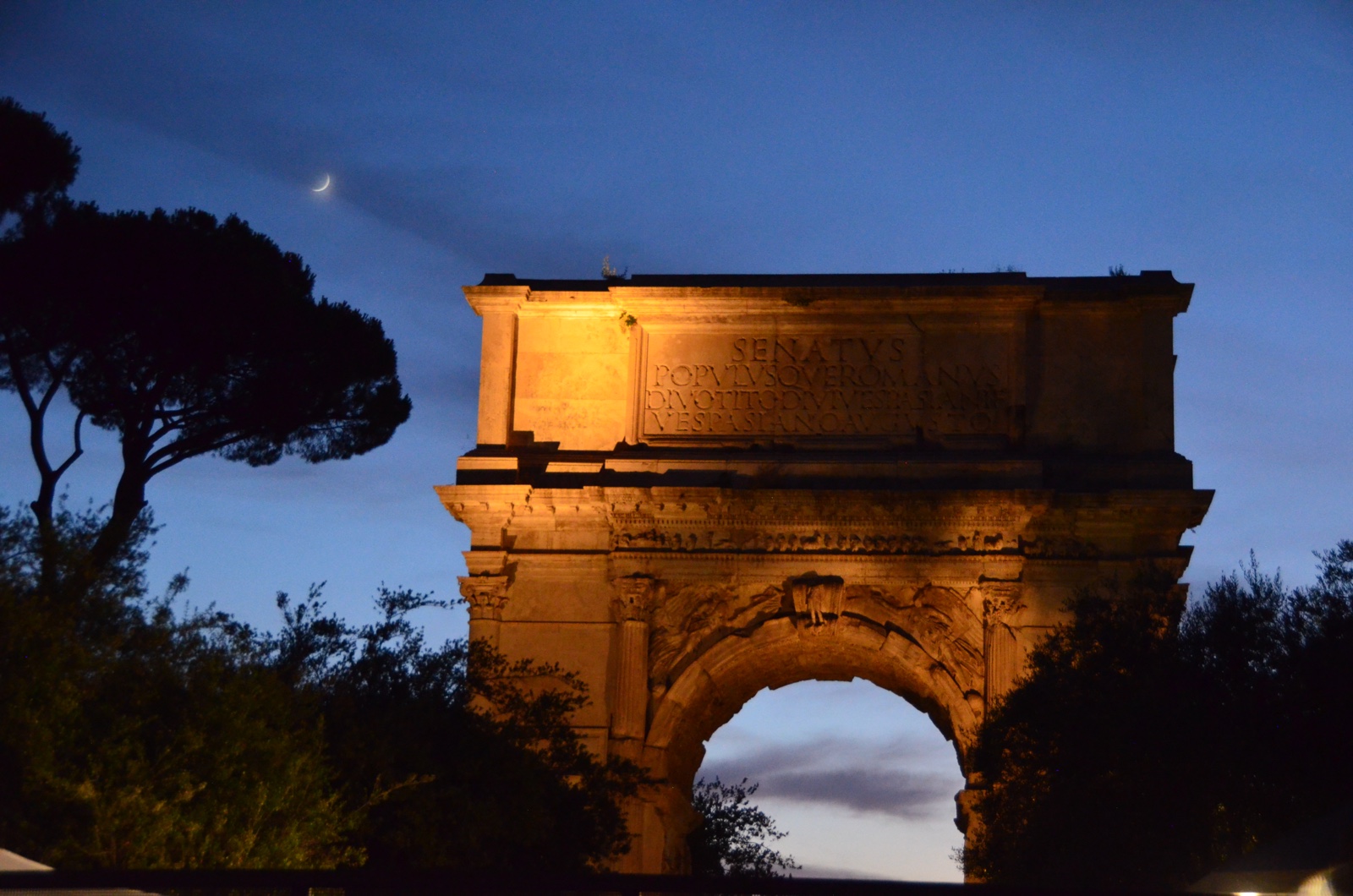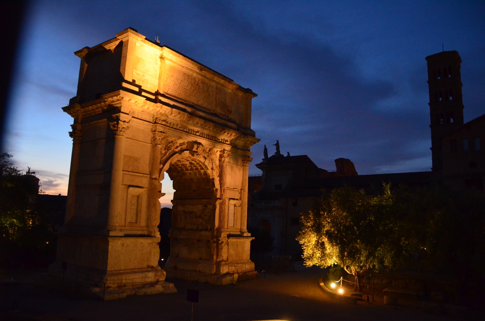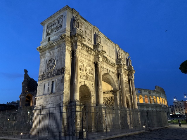 Just up a walkway is the Arch of Titus, constructed in 81 A.D. to celebrate the victory of Titus and his father Vespasian over the Jewish rebellion in Judaea. This arch overlooks the Roman Forum (which was closed at this time of night).