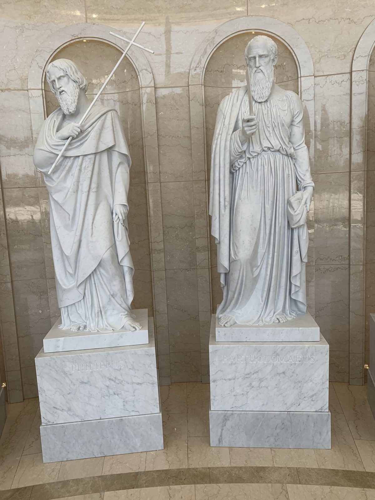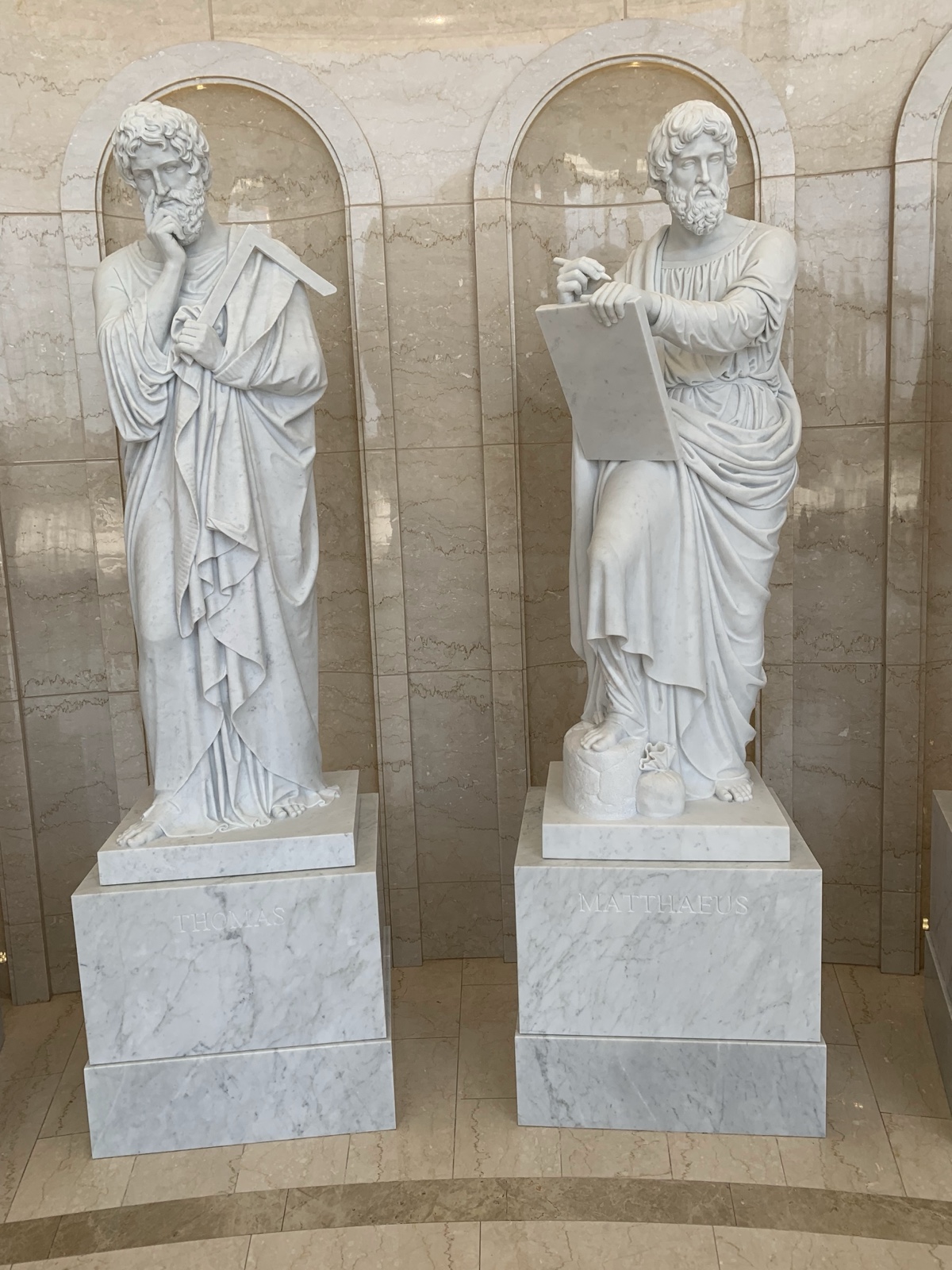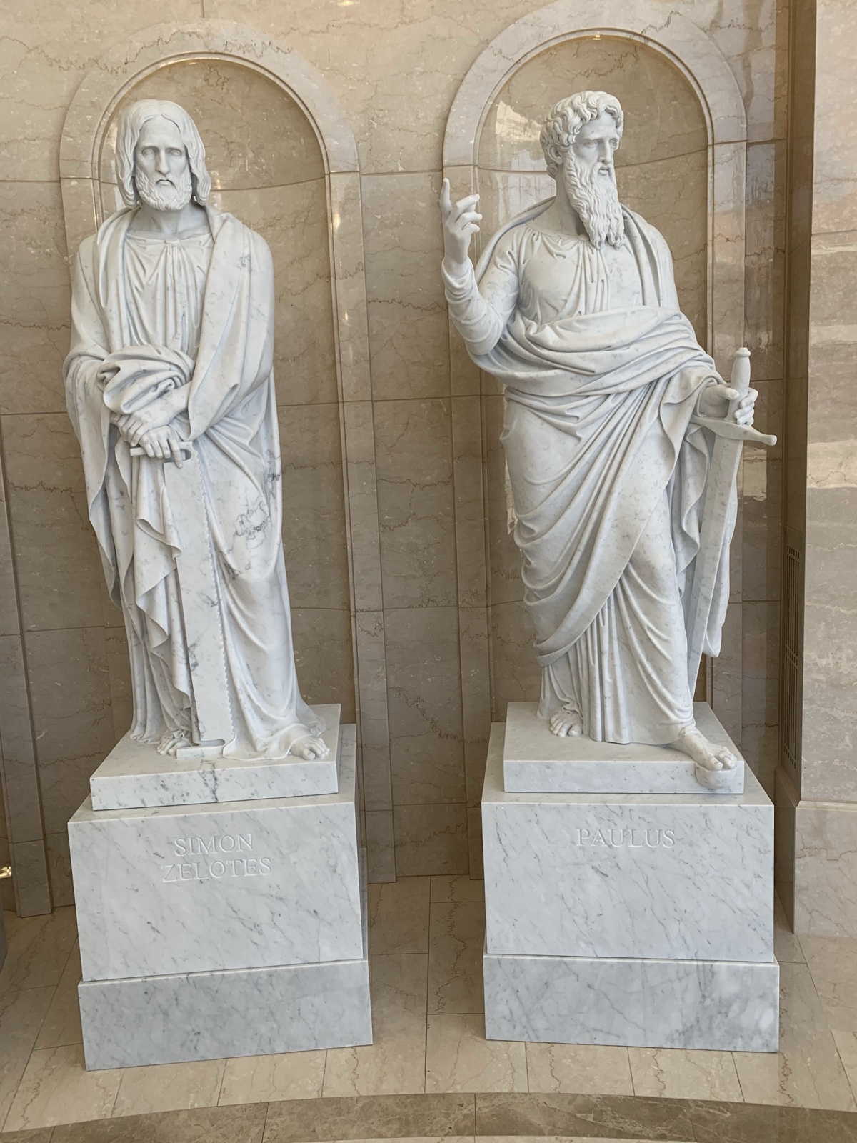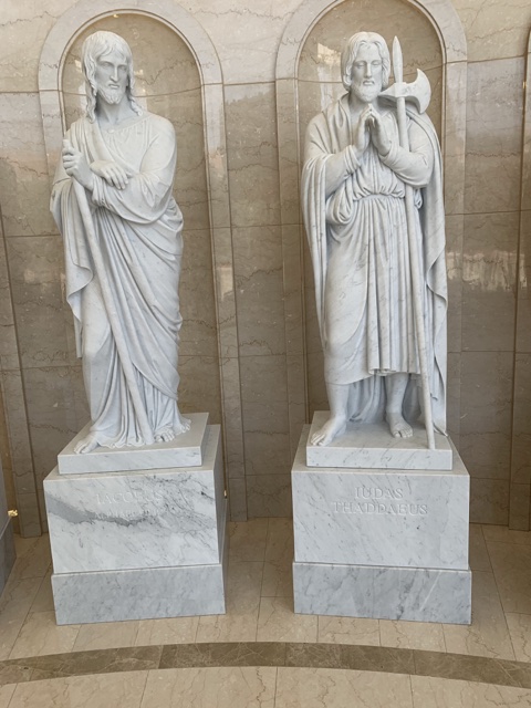 Each of the statues of the apostles has symbols that represent them.