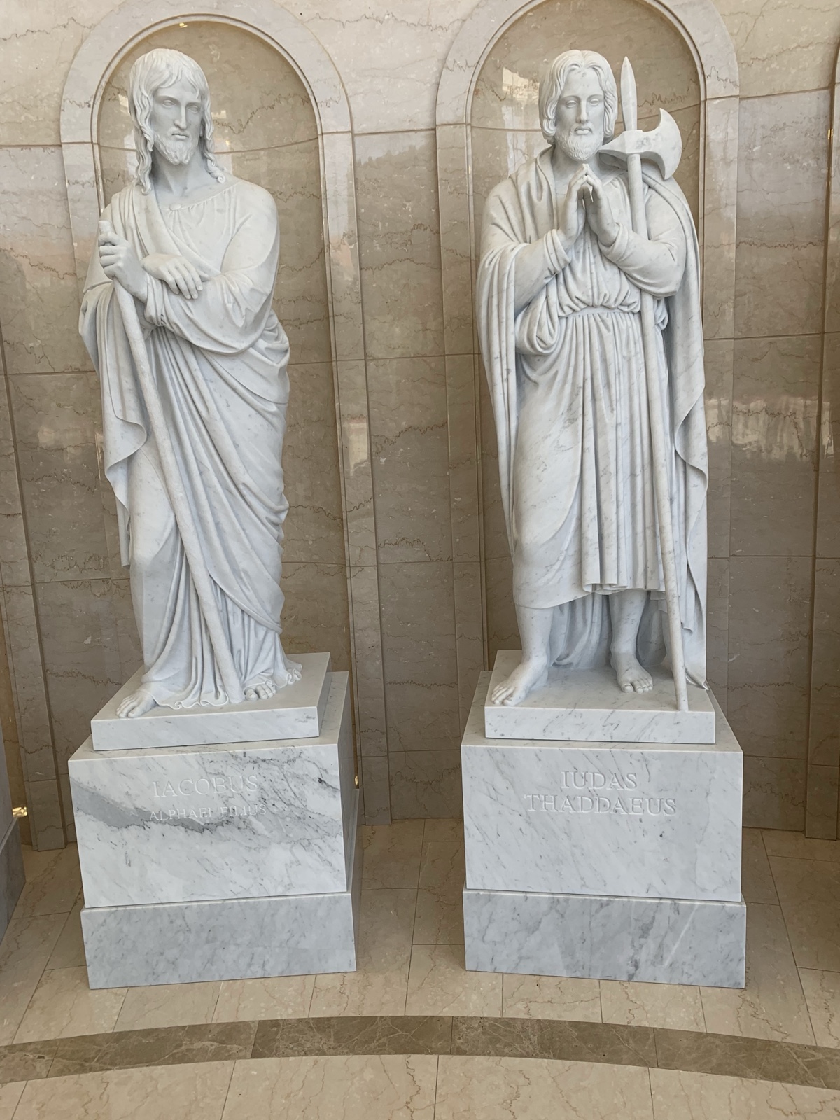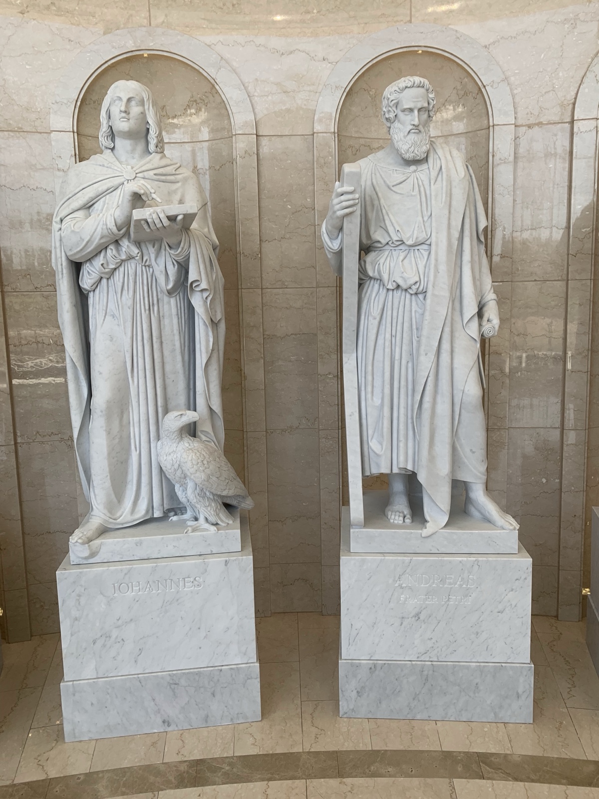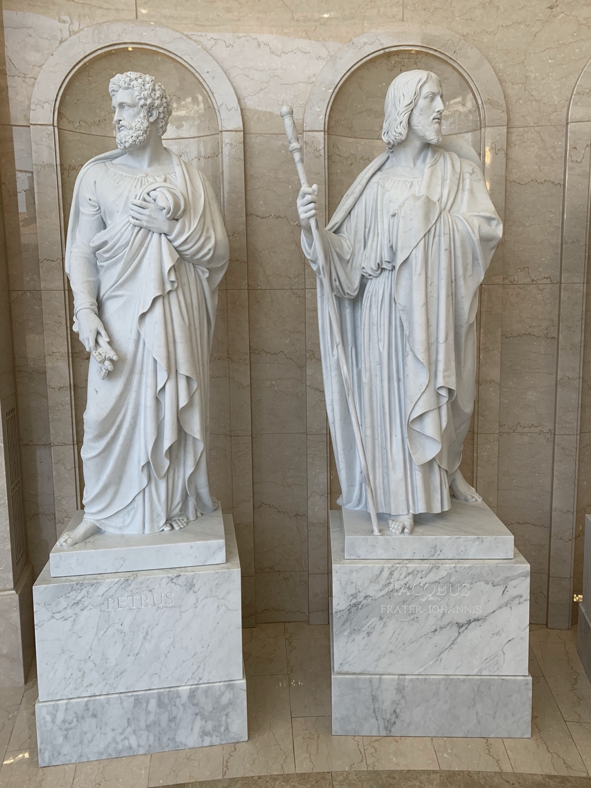 Each of the statues of the apostles has symbols that represent them.