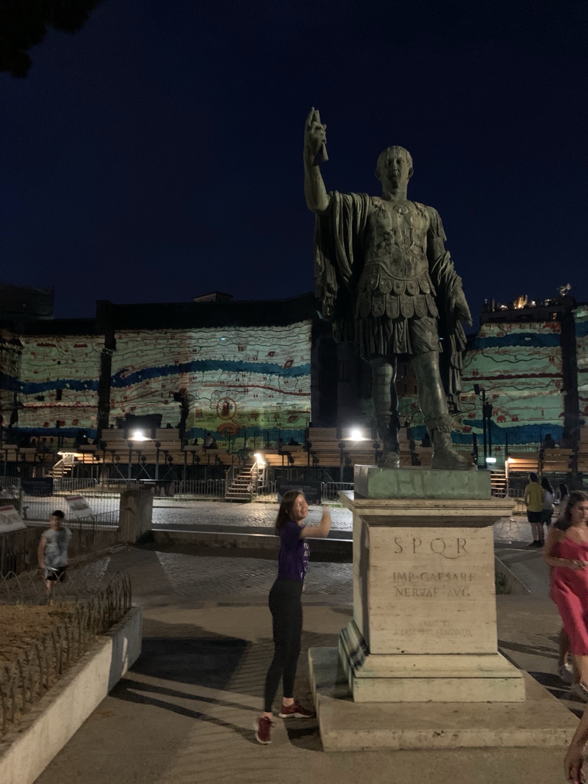 SPQR stands for Senātus Populus-que Rōmānus, referring to the government of the ancient Roman Republic. A video projection of some of the history of the Roman Empire was being shown on the walls in the background, which are the backdrop for the "Foro di Augusto", ruins of a structure built in the 2nd century B.C.