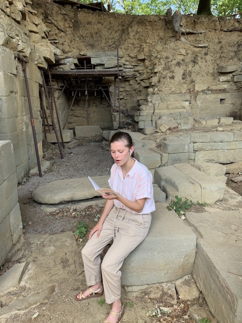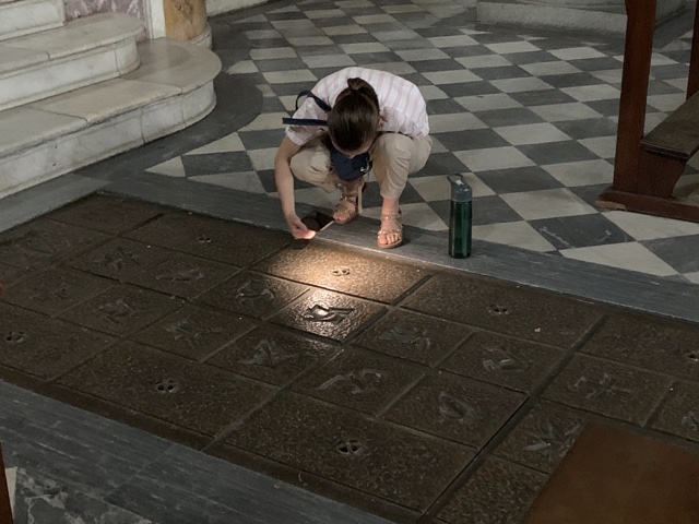 Here Sienna attempts to decipher inscriptions on the floor.