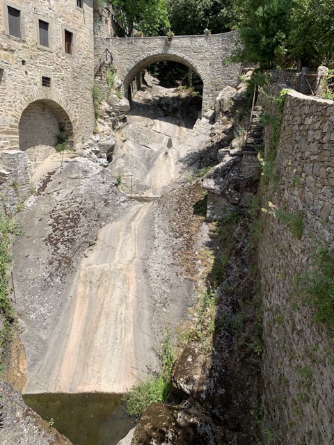 We crossed a bridge that went over a dry waterfall.