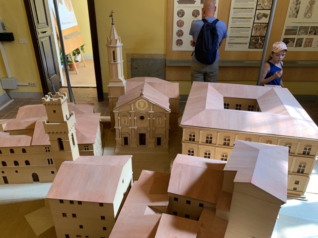 Here is a little model of this part of town, showing the cathedral with its bell tower and, off to the left, the town hall with its tower adorned by battlements.