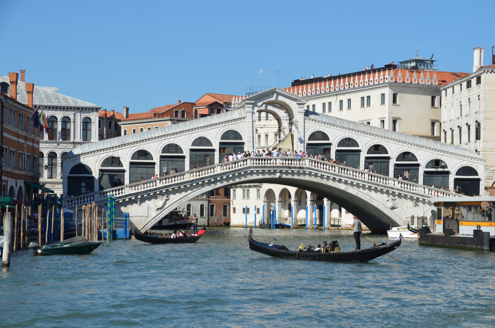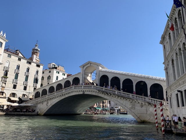 The Rialto Bridge is the most famous bridge in Venice. Like Ponte Vecchio in Florence, it has shops all along it, with a spot to look out in the middle.