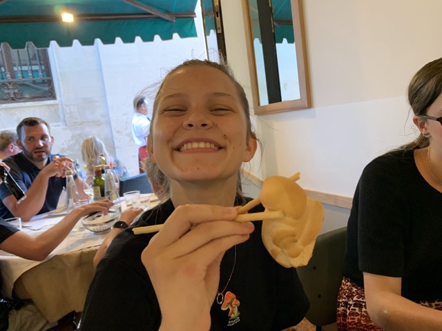 Near the square, a restaurant chose us to eat at it (aggressive guy out front), and it was great. Here Sienna uses two breadsticks as chopsticks to hold a bread roll (which subsequently tumbled to the floor when the "chopsticks" broke).