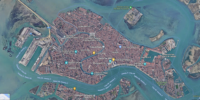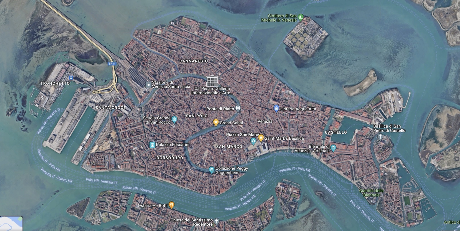 The historic city of Venice has 118 islands, connected by over 400 bridges. There are no roads, and transportation is done on foot or by boat. In the satellite picture below, you can see the (backwards) S-shaped "Grand Canal" that goes through the heart of the city.