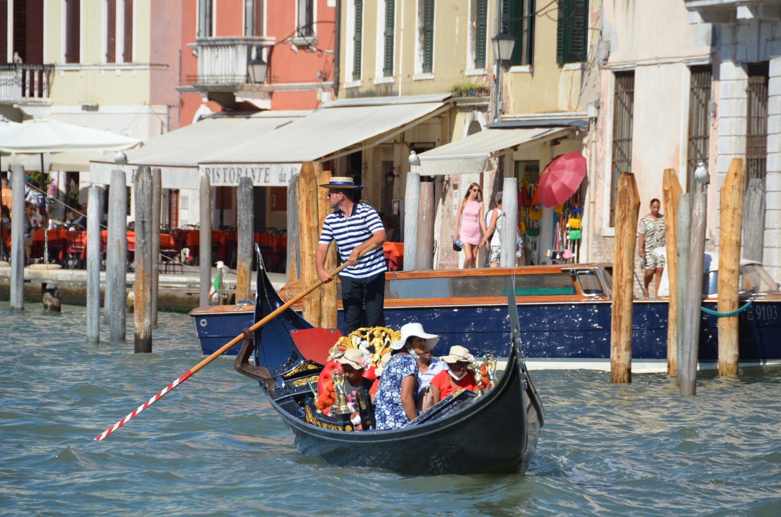 The grand canal is shared by water busses (Vaporetti), personal boats, and tourist gondolas. In addition, at a few points you can ride a gondola ferry (Targhetto) for just a few Euro, to get across the canal where there is no nearby bridge. People sit or, if they are daring, stand, as it goes across.