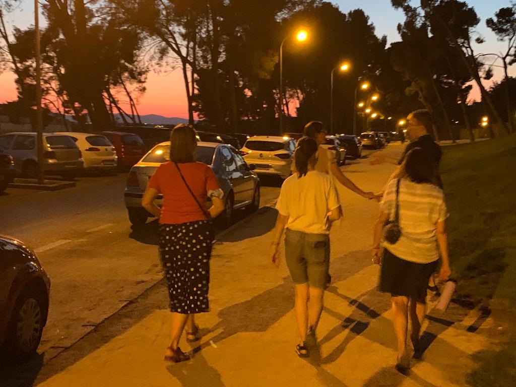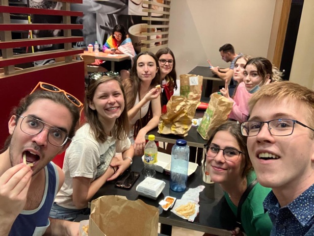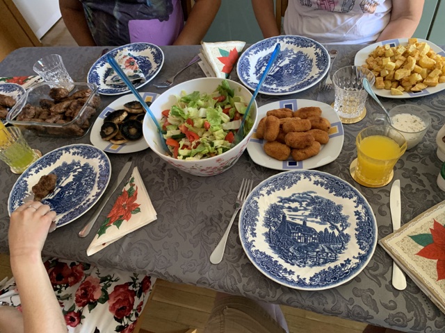 We got a variety of food and then passed it all around, including sausages, chicken, fried potatoes, bread, and more.