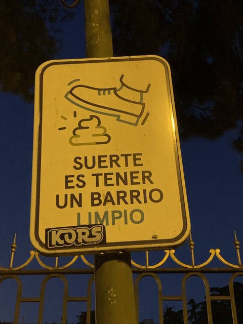 Just as being pooped on by a pigeon in Italy is supposedly good luck, so is stepping in dog stuff in Madrid. But this sign assures people that "Luck is to have a clean neighborhood" (so please pick up after your dog).