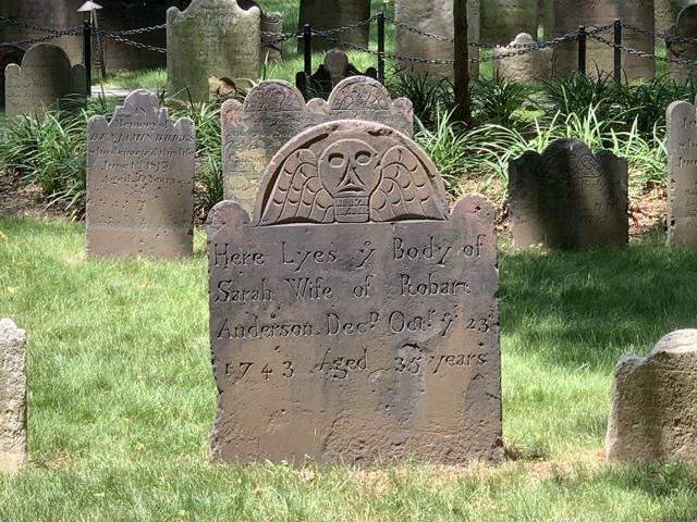 The old tombstones were interesting. This one from 1743 spells "lies" as "lyes" and has a skull with wings on it.