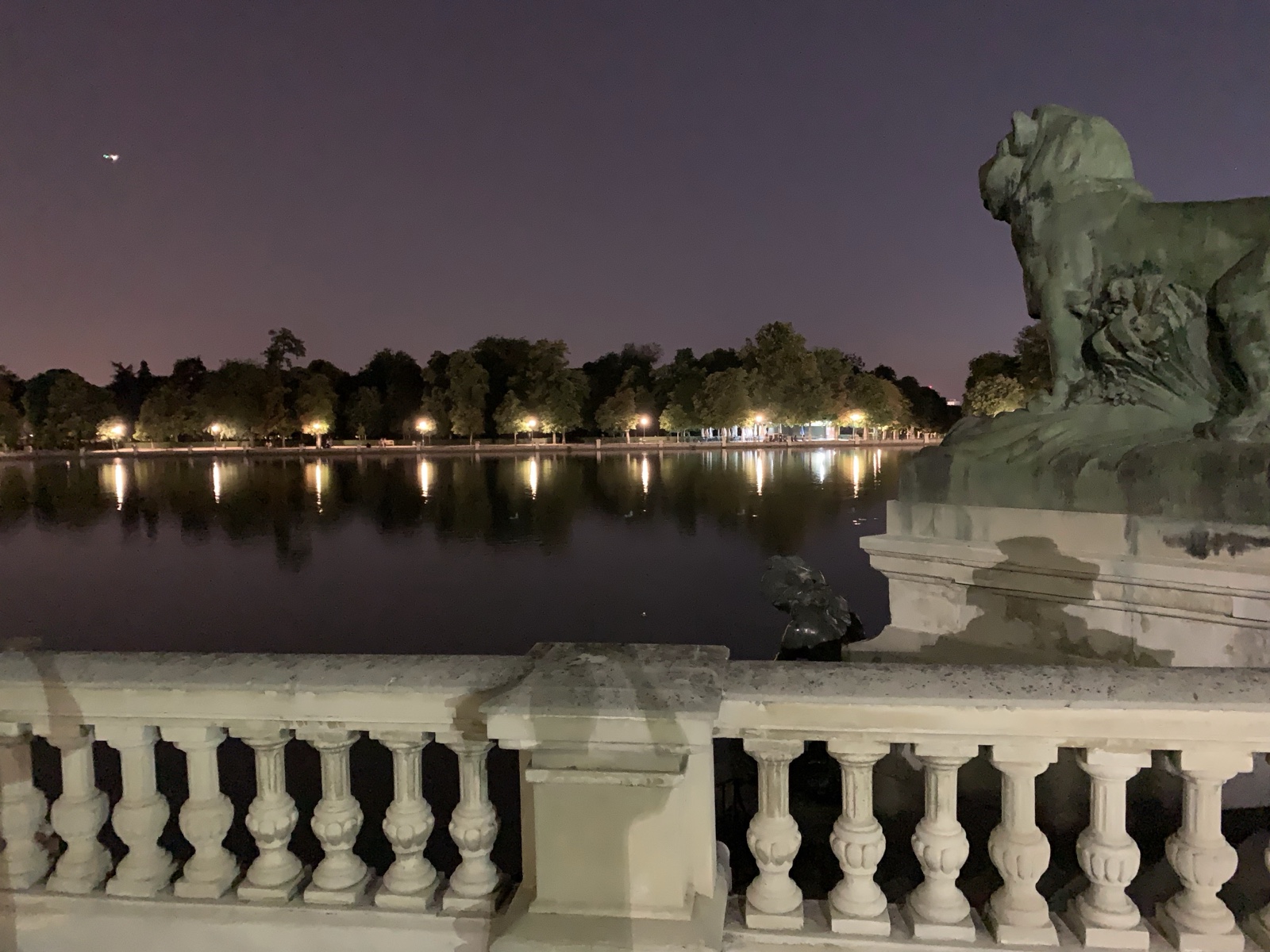 A statue of a lion overlooks the lake.