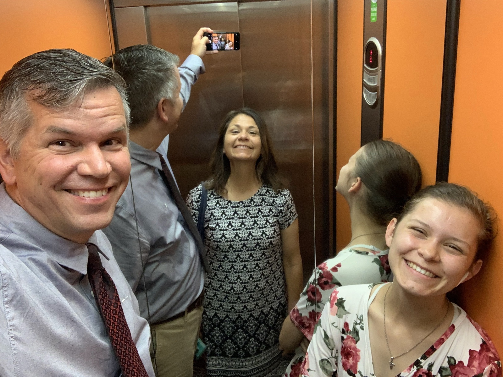 Here's our elevator mirror selfie on our way back from church.