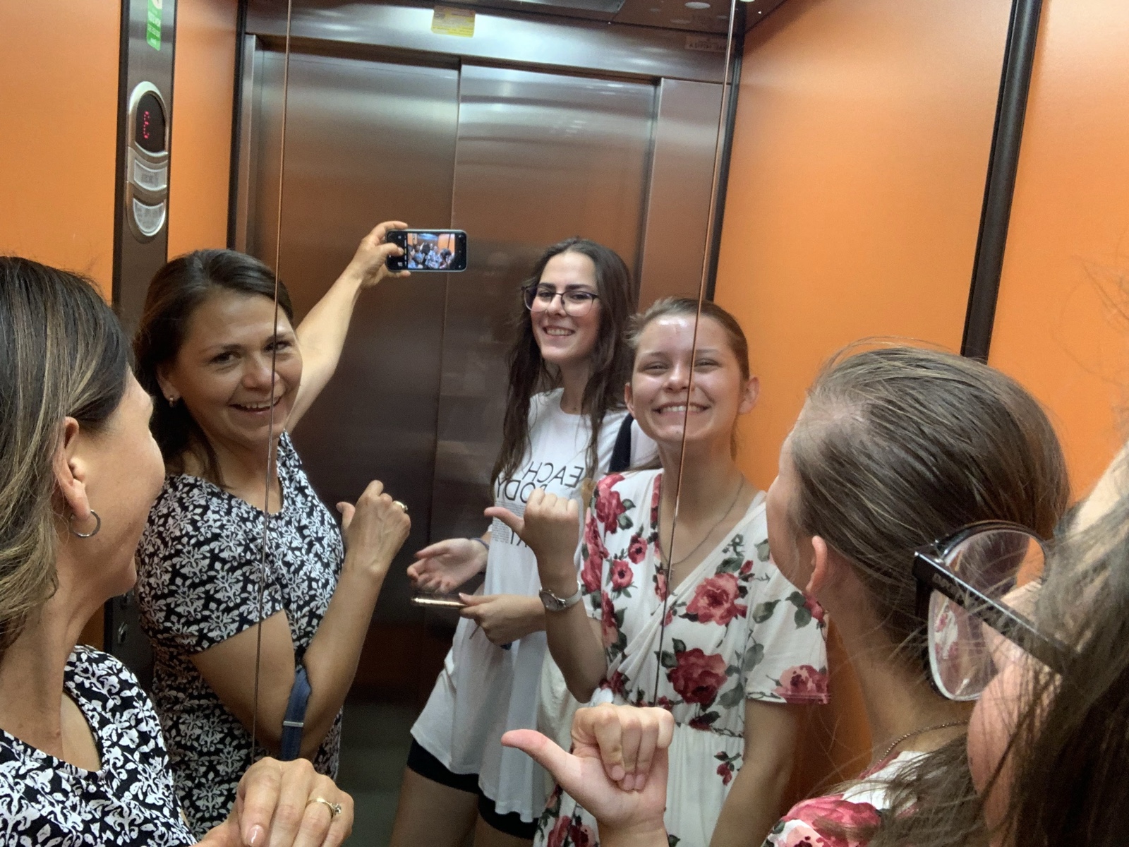 The gals went to grab some things for lunch, and took their own elevator mirror selfie.