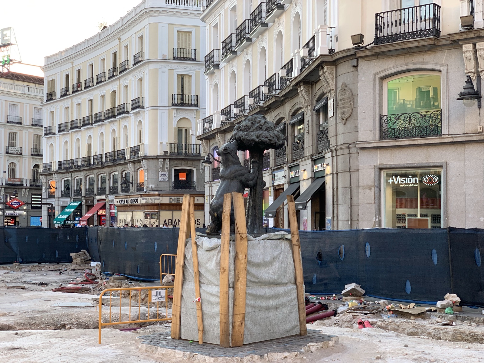 The symbol for Madrid has been a bear since at least 1212 A.D., but in 1222 the church and city claimed the forest and fields in the area. King Alfonso VIII decided that the trees would belong to the city, and the animals to the the church, so both parties would feel a responsibility for taking care of the area. That worked for everyone, so they made the symbol for the city be a bear and a "strawberry tree". (Of course, strawberries don't grow on trees, but they really meant madroños, which do). Here's a sculpture in the center of town (in a construction zone at the moment) of the bear and tree.