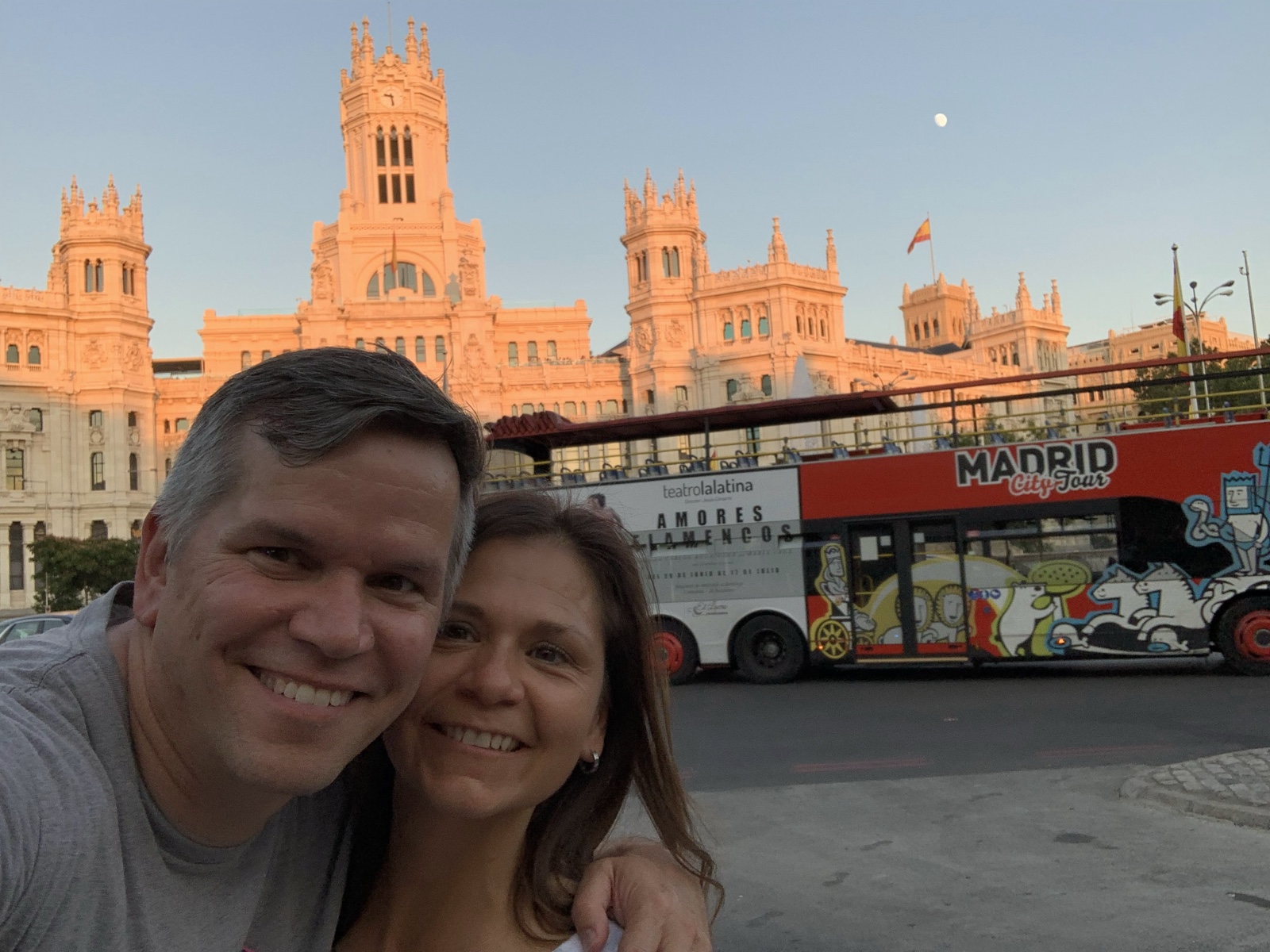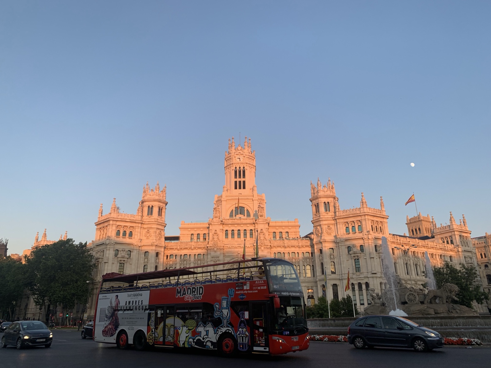 I thought this was an iconic shot with a red Madrid double-decker bus in front of the Cybele Palace.