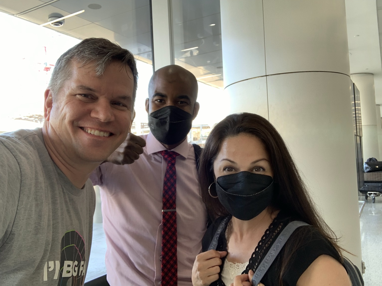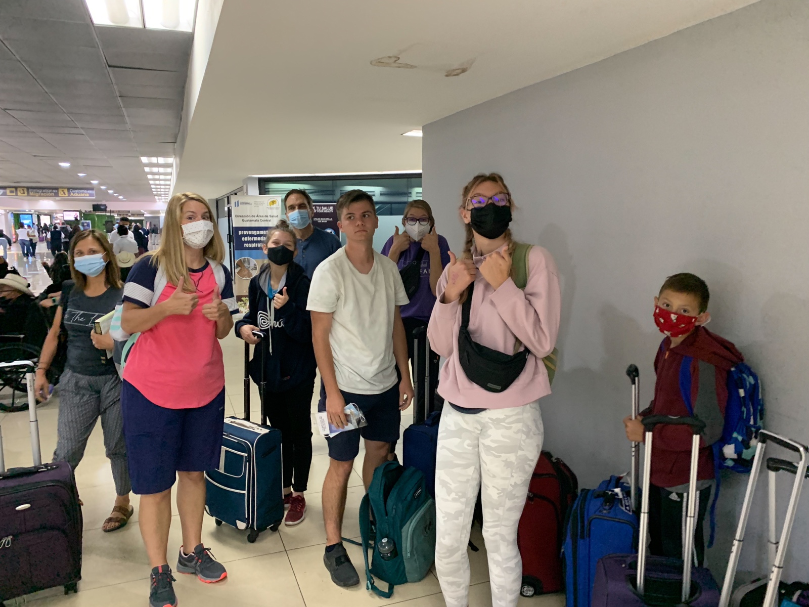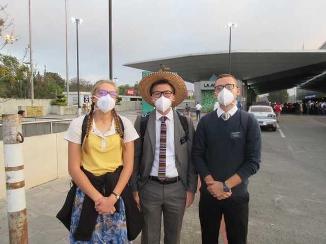 | Mikayla Kartchner, Jared Wilson and Bentley Alldredge, preparing to board their plane home from Guatemala. March 2020. |