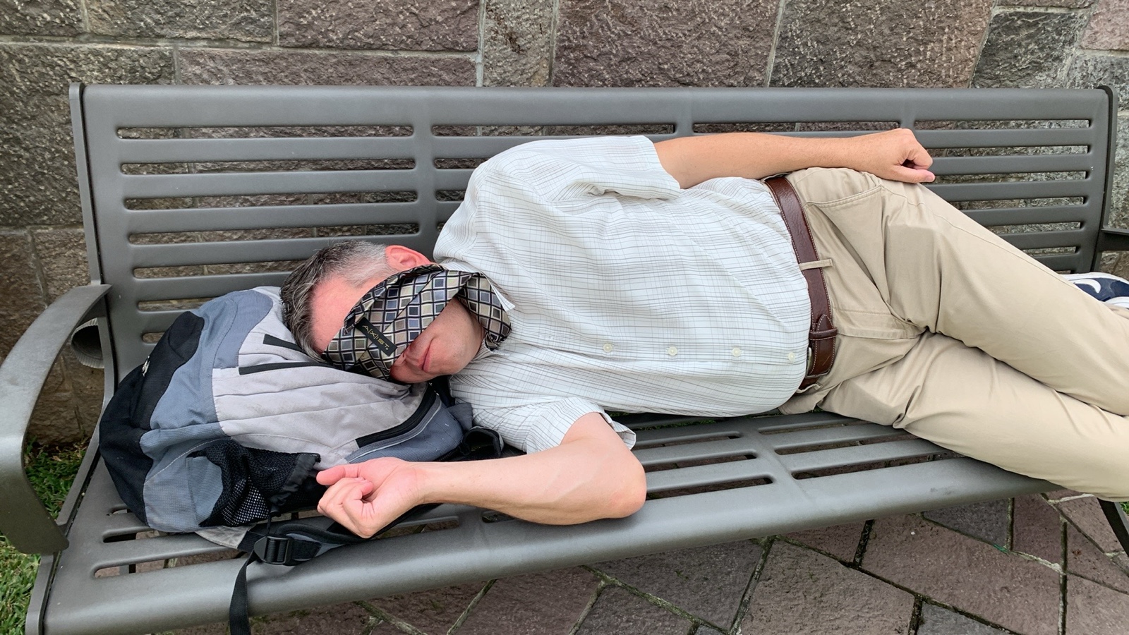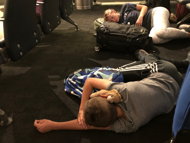 Our flight didn't leave until midnight, so we knew we were all going to be tired, so some of us tried to catch a little sleep on the hard floor upstairs during our wait. It wasn't especially successful.