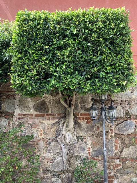 And here is Sienna hanging out with the purple flowers and the tree that seems to be growing out of the wall.