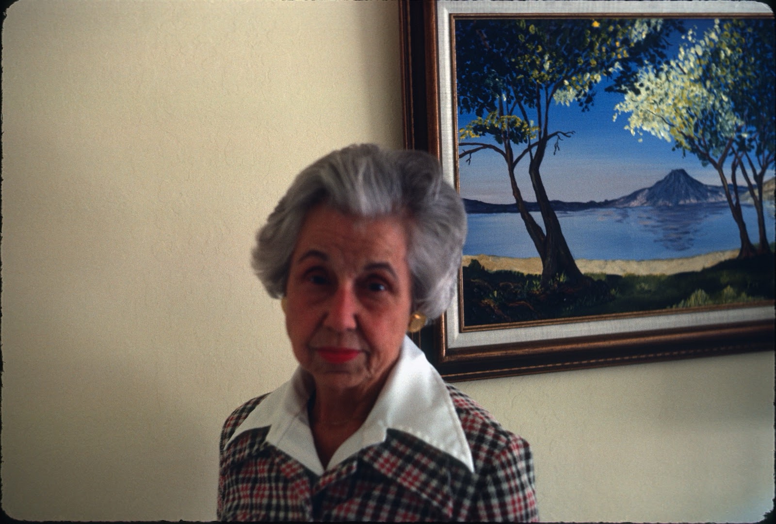 | Thelma Holdaway Merrill, 1978, in front of her painting of Lake Atitlán. |