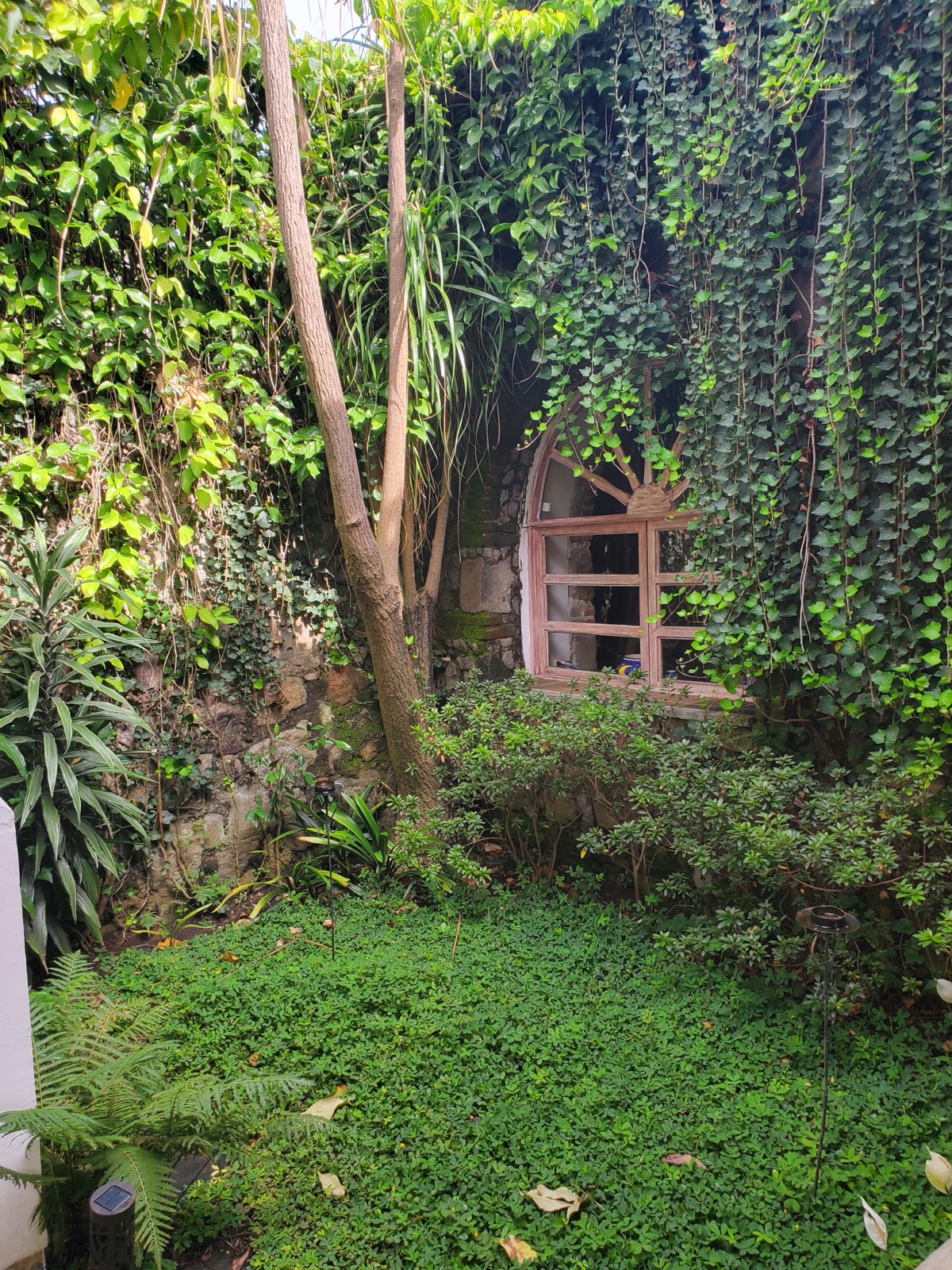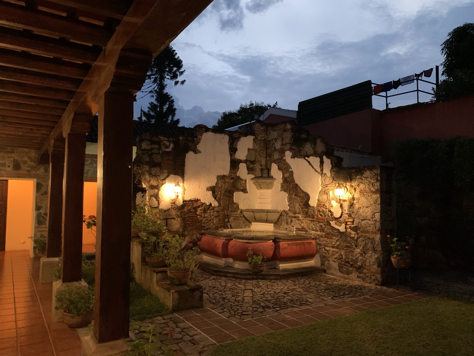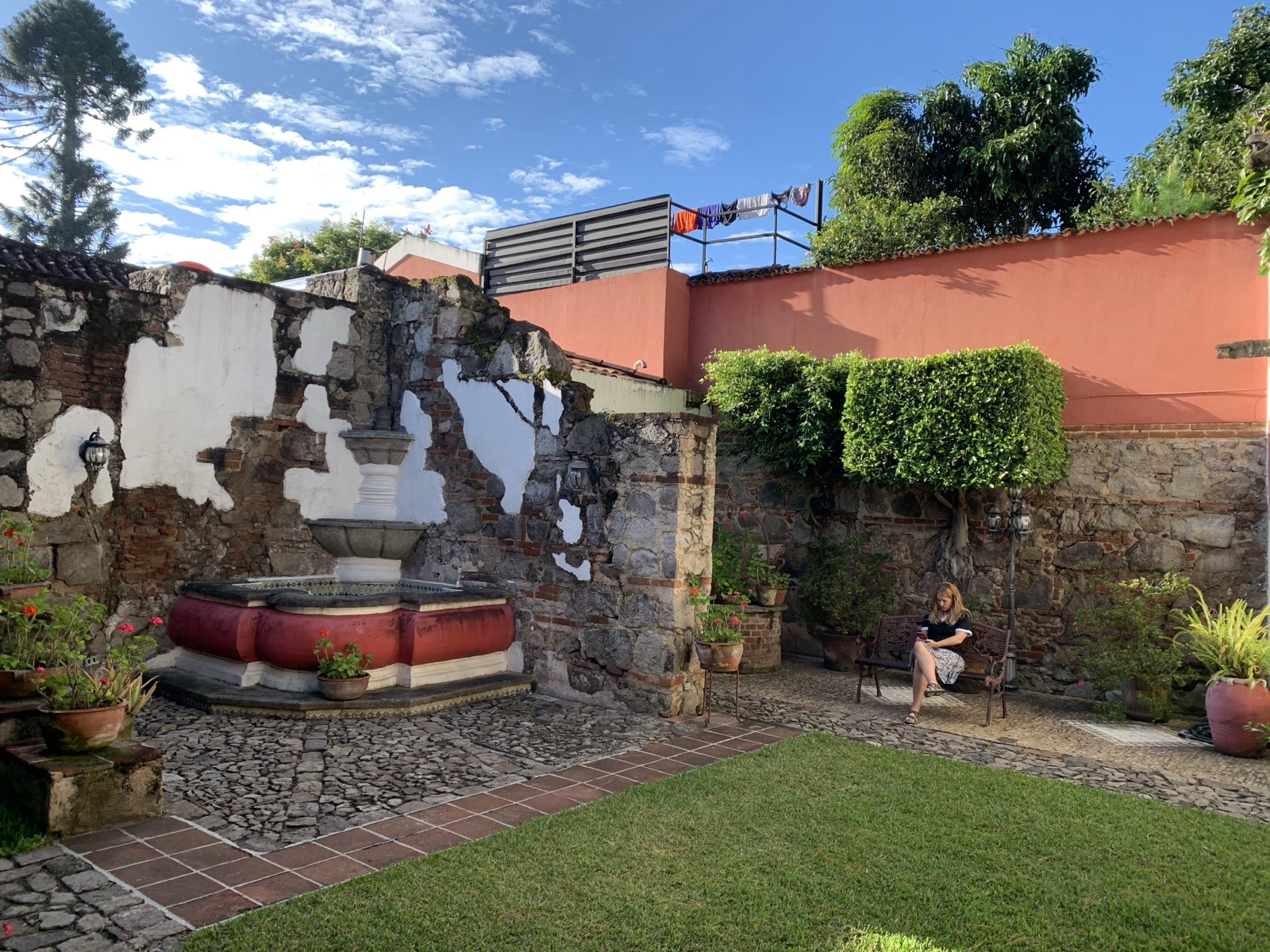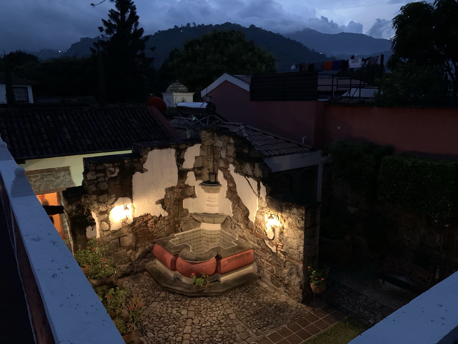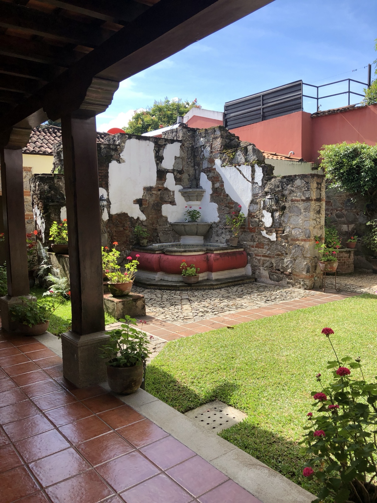 There's a cute fountain in the courtyard and it looks like the newer home integrated existing walls from earlier construction, which gives the place a charming look.
