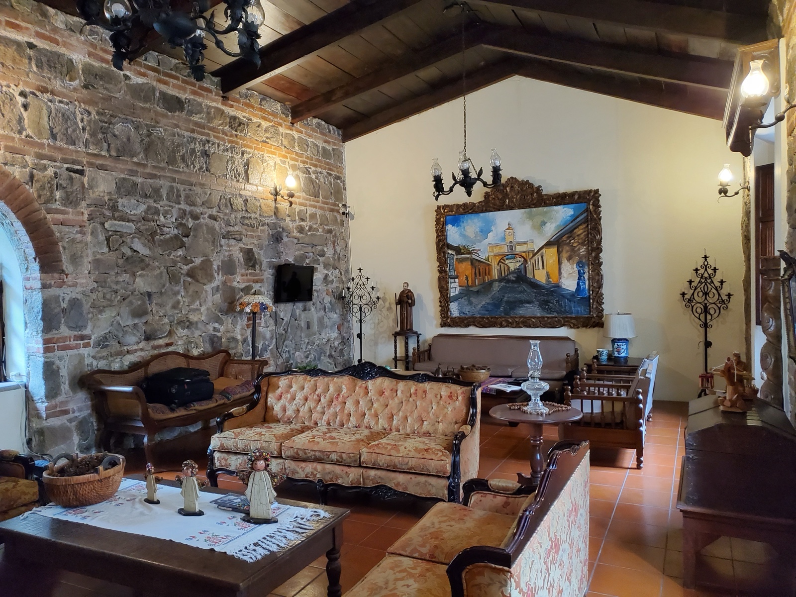 If you walk to that car and turn left, you end up in this beautiful living room, without even opening a door! The weather is so nice all year, that they can just leave it open to the outside. This part of Guatemala is sometimes called the "land of the eternal spring." (There is a screen mat that can be pulled down to keep bugs and birds out when not in use).