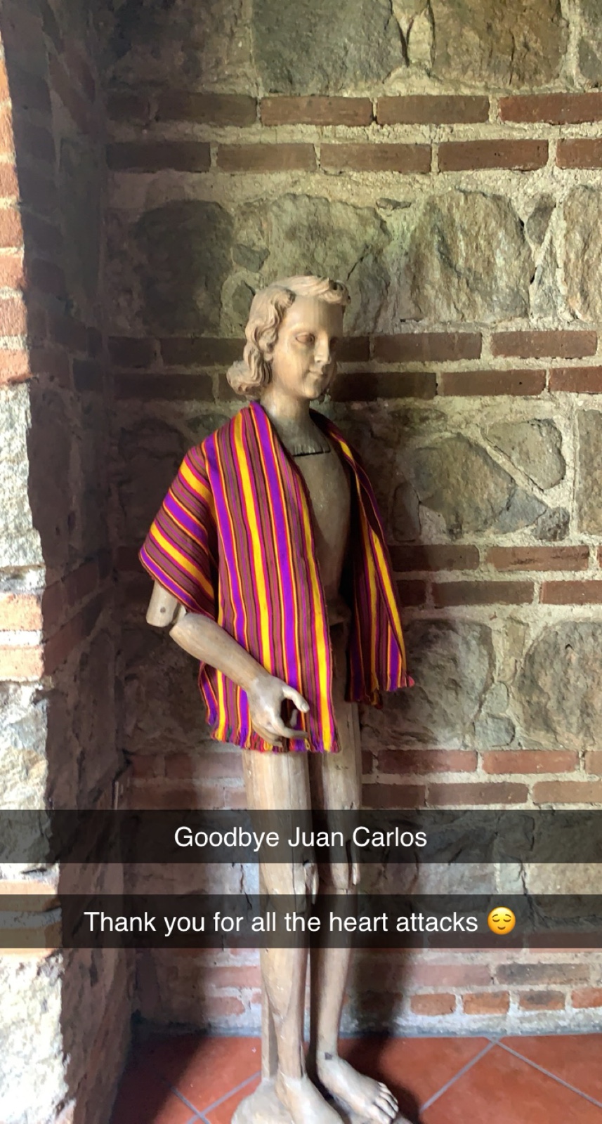 There was a wooden mannequin in the parking area between the living room and dining room, and he sort of startled us every time we walked by. The kids named him "Juan Carlos". Here is Sienna's tribute to him.