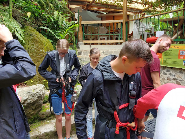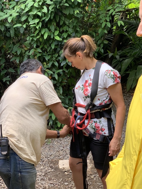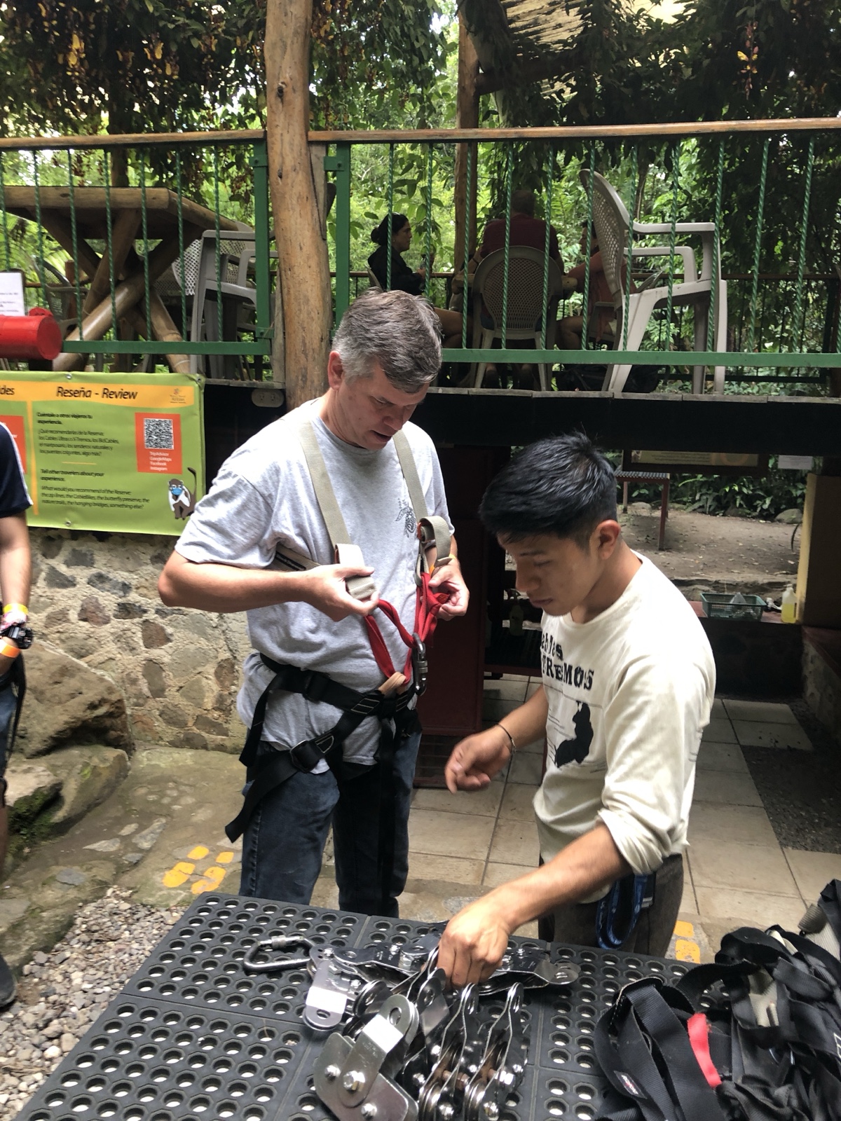 We all got set up with harnesses and such, and then the guy gave safety instructions in Spanish while a guy who grew up in Guatemala roughly translated for the group. Linette threw in a couple of clarifications when needed.