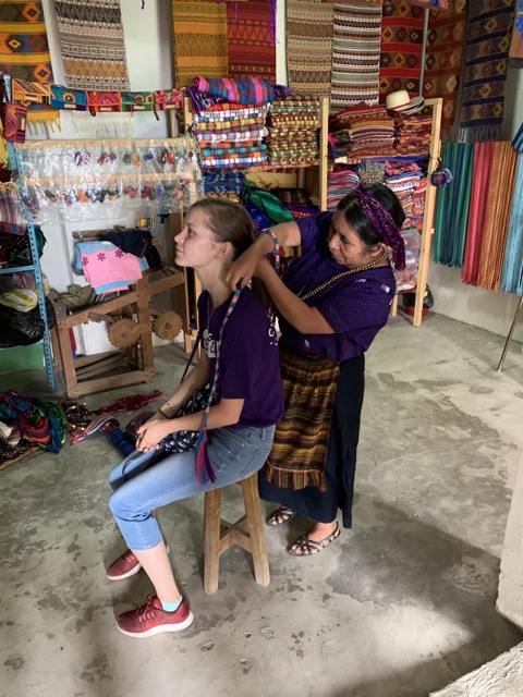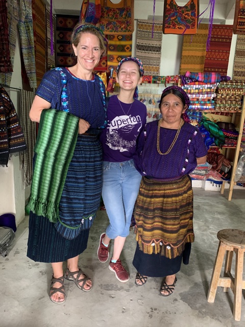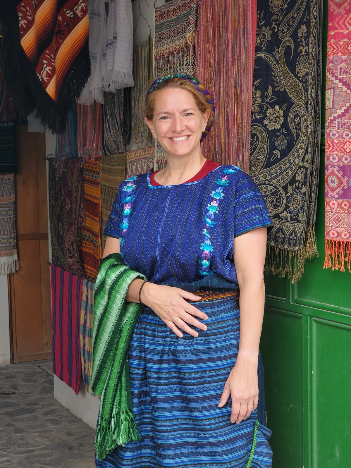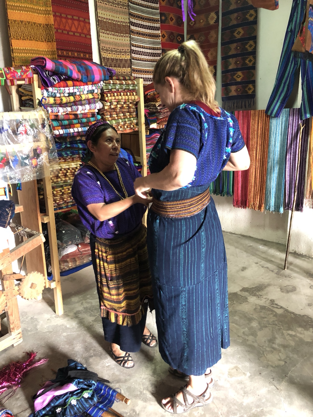 Tuh-duh! People in the village smiled when they saw Sharon wearing this outfit. The corte is the skirt wrapped around the bottom half. The huipil (WEE-peel) is the blouse.