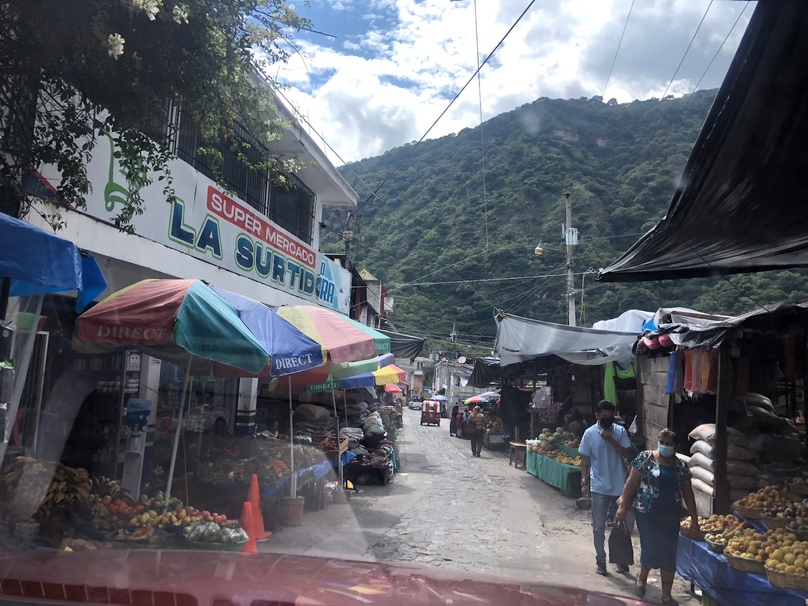 We eventually arrived in the town of Panajachel, which is one of the bigger towns on Lake Atitlán. We had to wend our way through some crowded streets and even drive right through a market to get through there.
