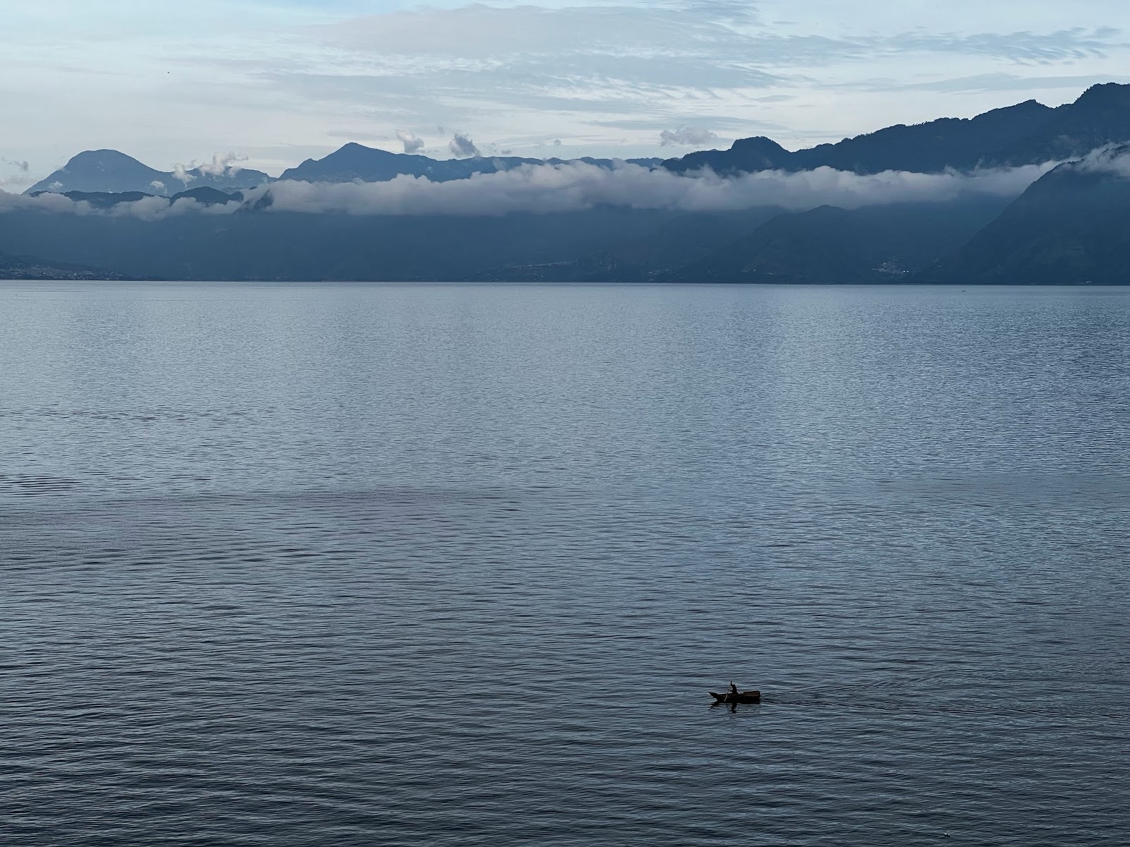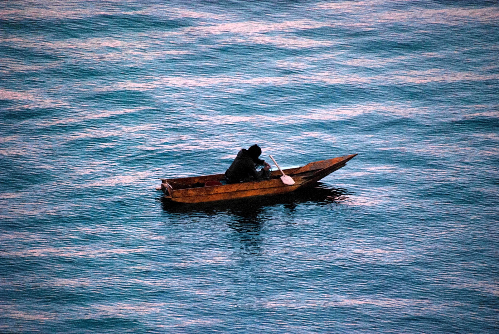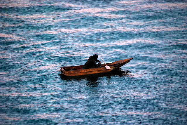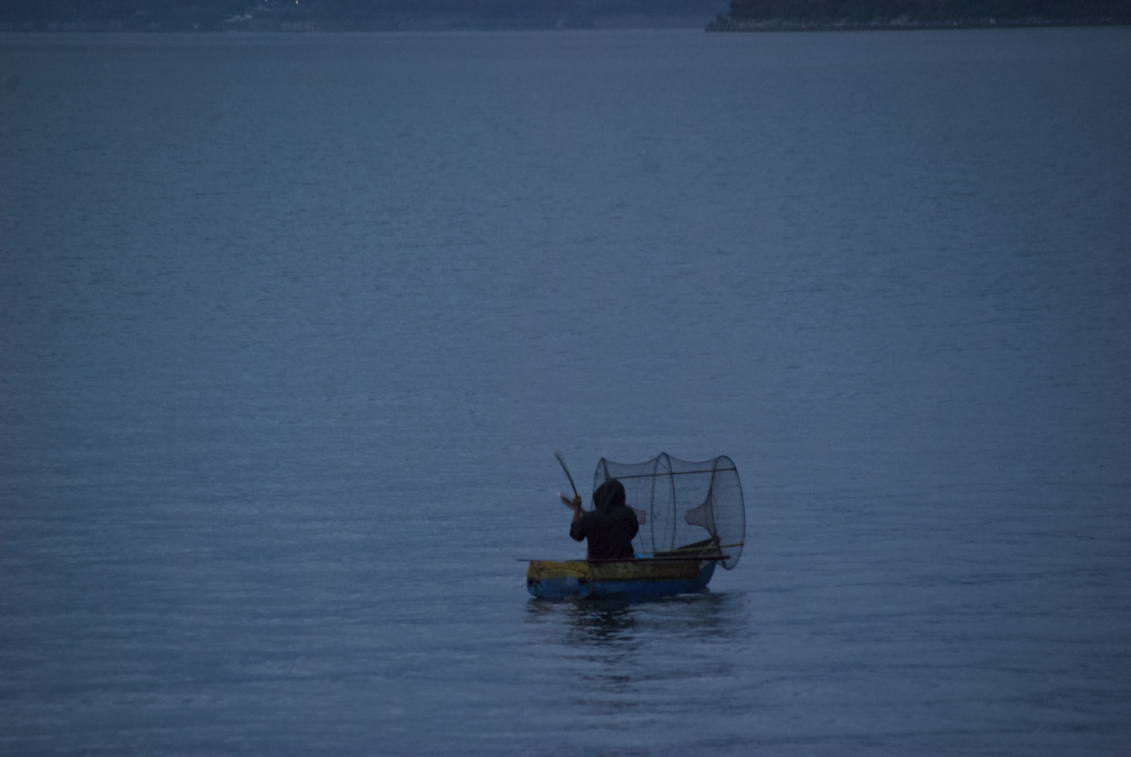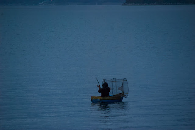An early-morning fisherman paddled by in his traditional boat.