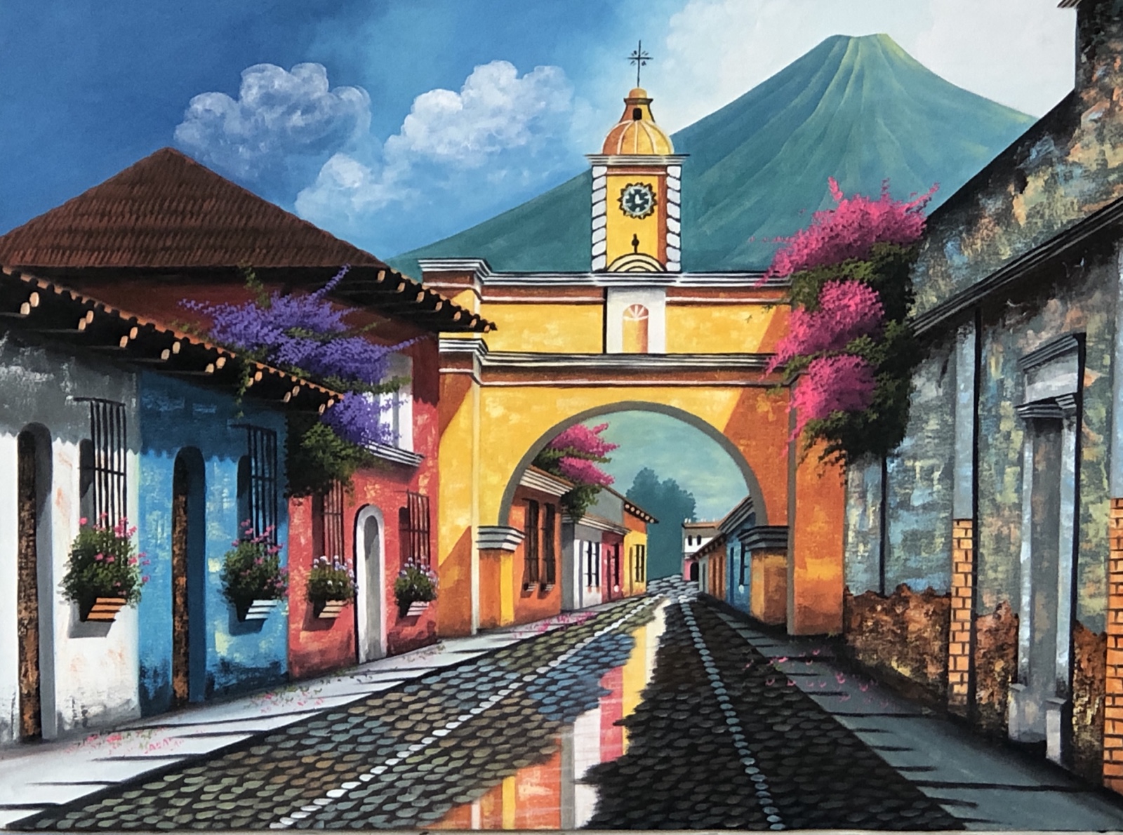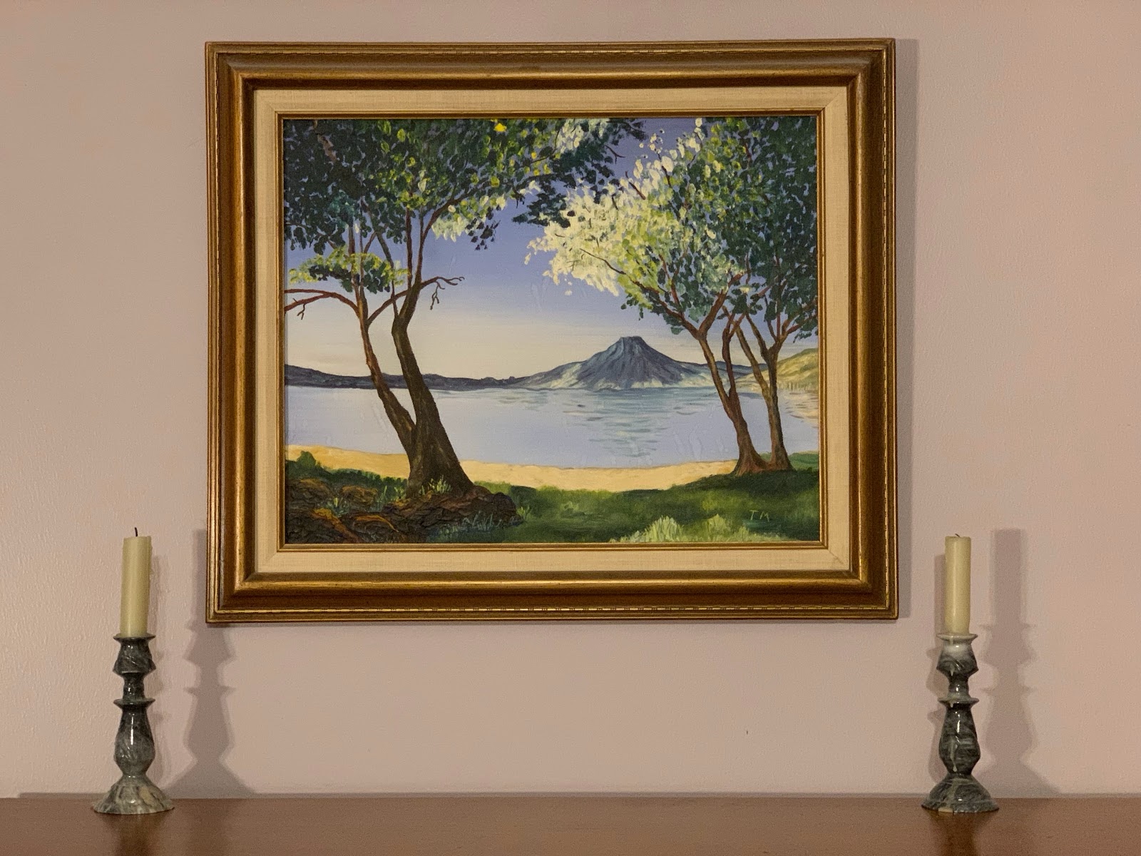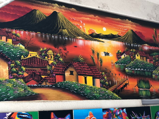 Thelma Merrill did a painting of Lake Atitlán. She used a postcard as a guide, but she said she moved the volcano over a bit to "give it better composition." Here it is as it hangs on our wall today.
