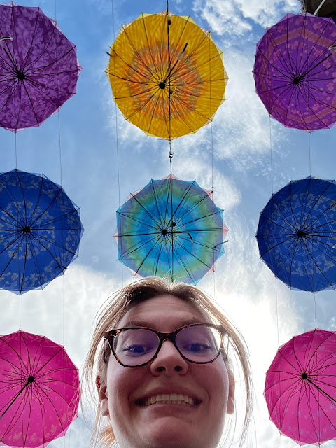 Another street had colorful umbrellas over it.