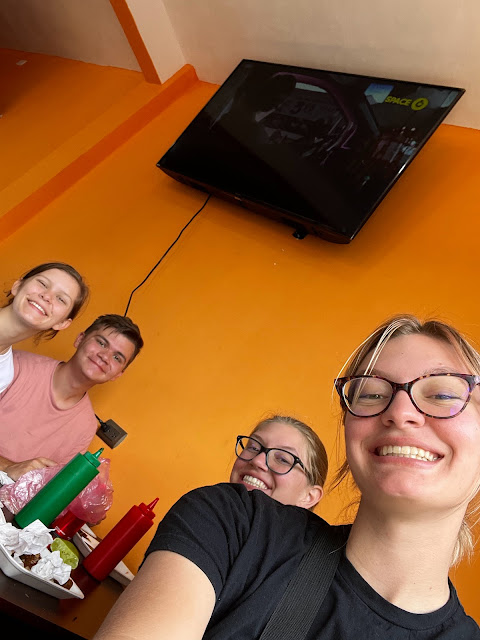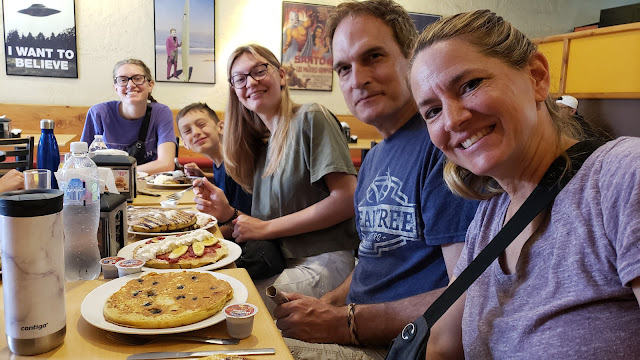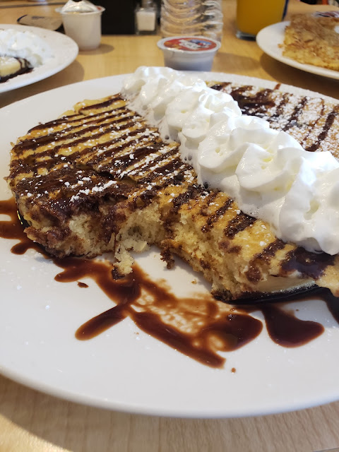 Linette took several half-pancakes that weren't touched and put them in a to-go box. Then, as we walked down the street, she told a young lady that we had extra pancakes and asked if she would like them. She happily accepted, and I thought that was so thoughtful.