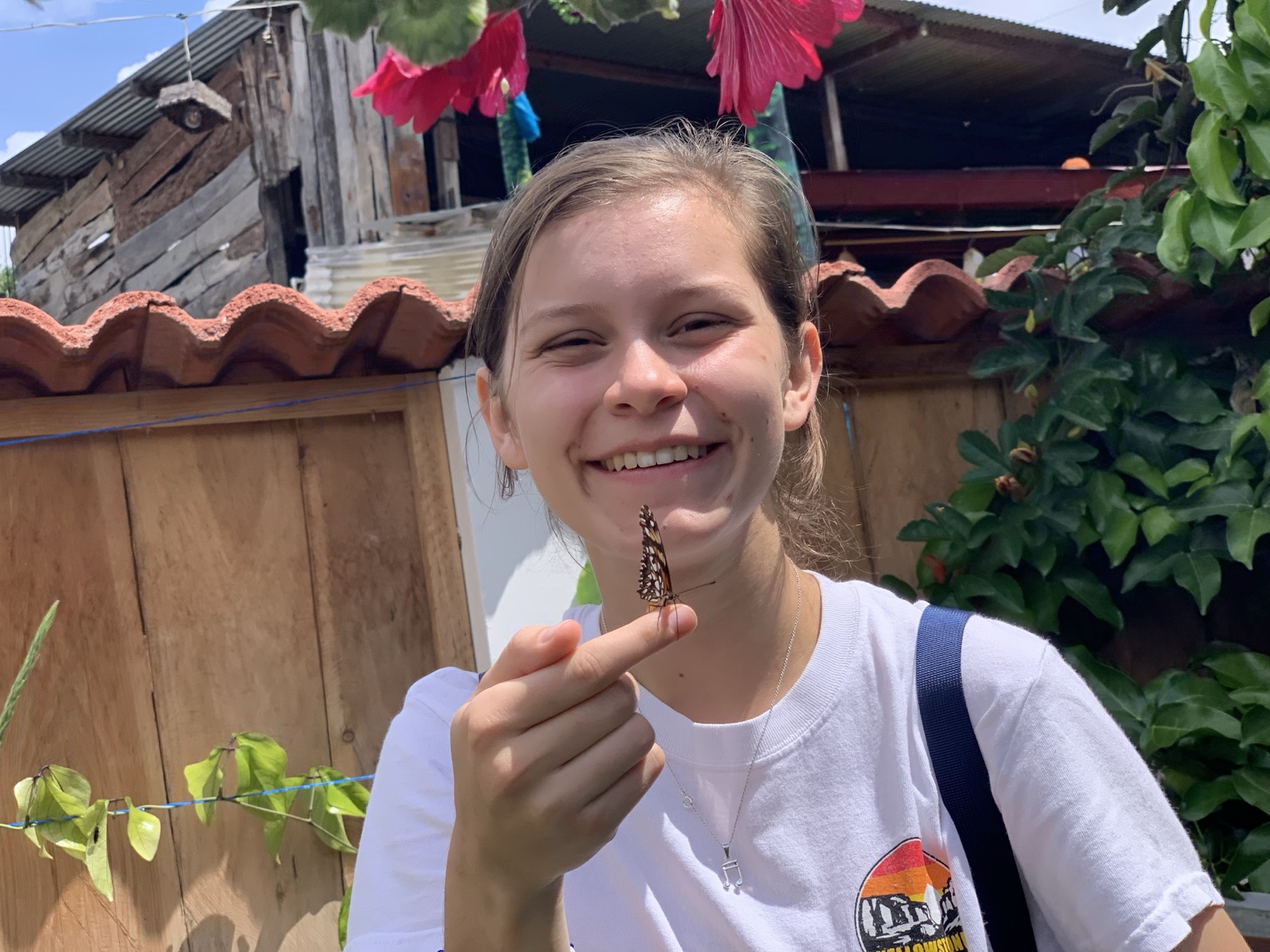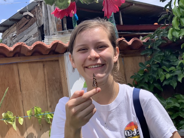 A butterfly (mariposa) landed on Sienna's finger while she was there.