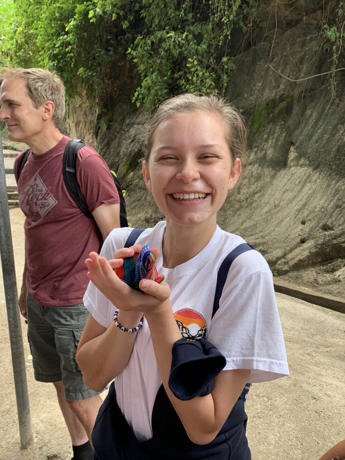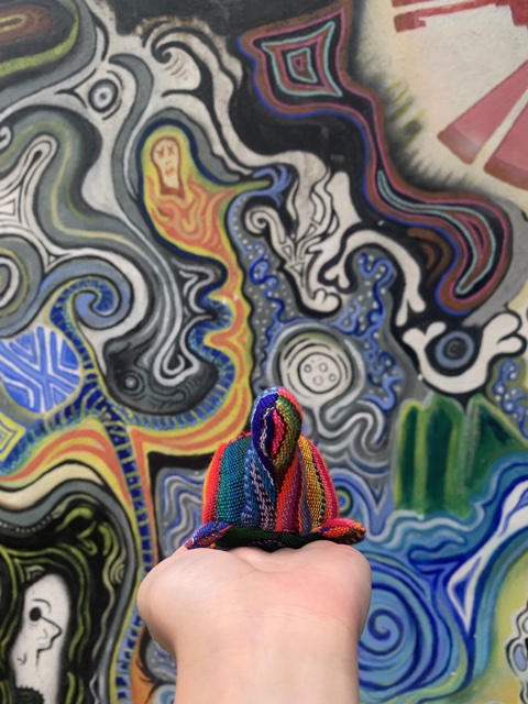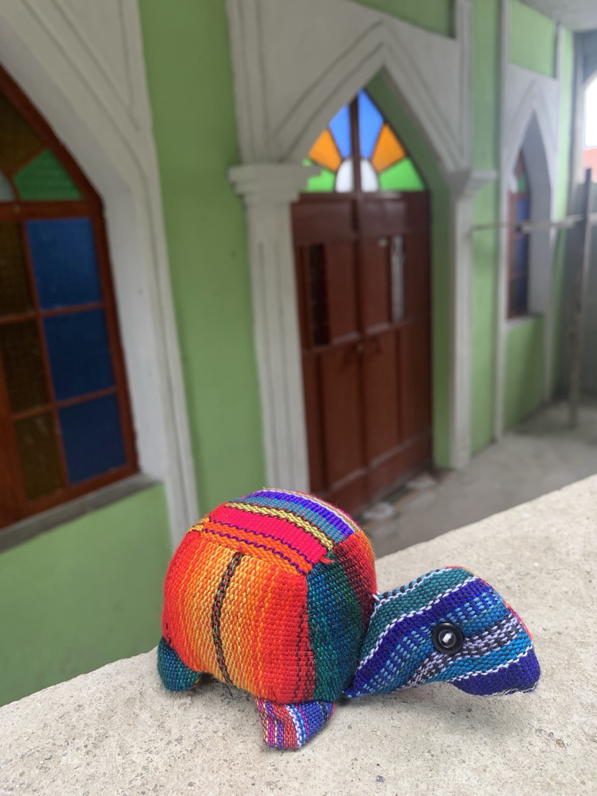 Here's Sienna in Guatemala, wearing a Peru hoodie, hanging out with Tugs the colorful turtle.